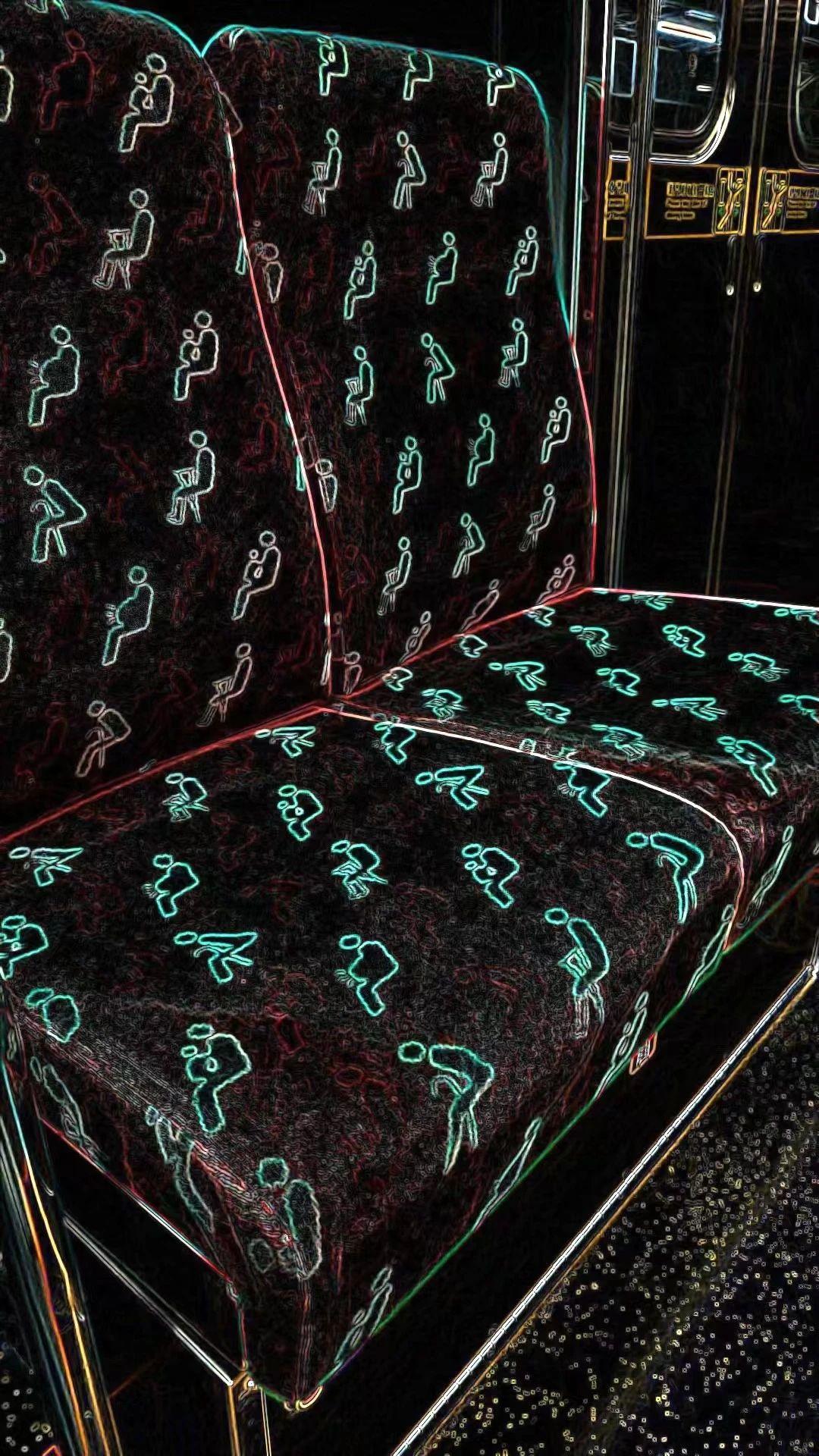 这幅作品展示了椅子表面的独特纹理和图案,使用了高对比度的色彩,使得图案突出。椅子上的图案似乎是简化的人形符号,可能暗示某种公共交通工具的座椅设计。整体色调偏暗,具有一种未来感和科技感。