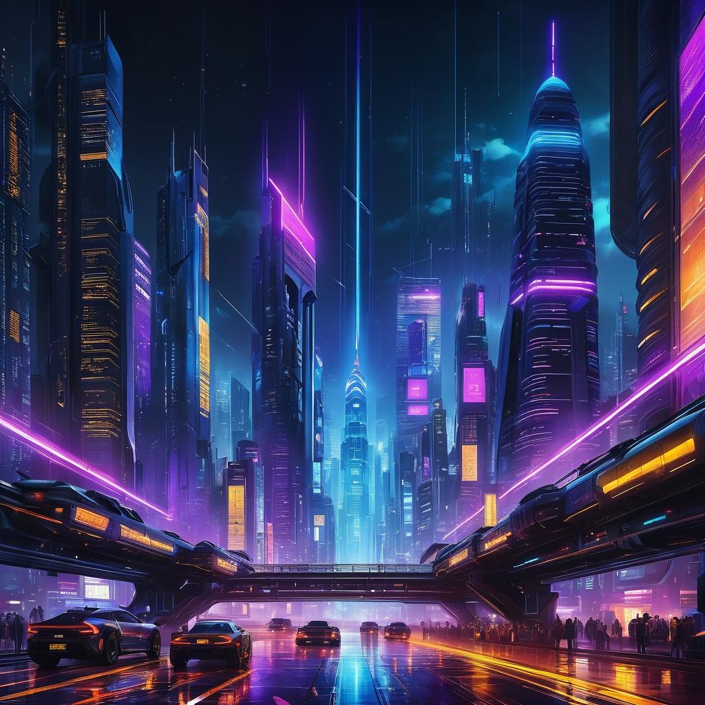 这幅城市夜景作品通过冷色调的运用和对称的构图,展现了现代都市的繁华与孤独。画面中,高楼大厦的灯光与夜空形成鲜明对比,蓝色和紫色的冷色调主导了画面,但点缀着温暖的黄色和橙色灯光,营造出一种现代与未来感并存的氛围。情感表达上,画面传递出一种繁忙与宁静并存的矛盾感,既有都市的喧嚣,也有夜晚的静谧。