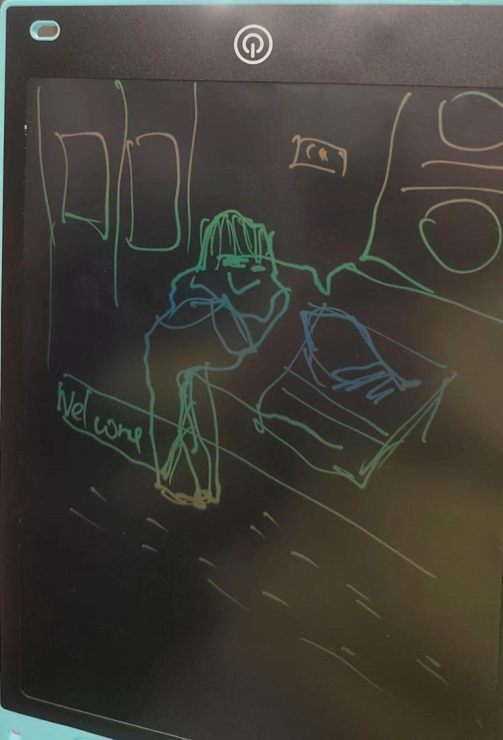 这幅作品给人一种天真和原始的感觉,类似于儿童的涂鸦或初学者的绘画作品。通过这种简单的表现手法,它传达了一种纯粹和直接的情感。为了提升这幅作品,可以添加更多的细节和背景元素,以丰富画面的内容。例如,在人物周围添加更多的房间细节,如窗户、灯光或其他家具,以增强空间感。同时,运用更丰富的色彩和渐变效果,提升整体的艺术性和视觉吸引力。通过这些改进,作品可以在儿童艺术领域中更具辨识度和情感共鸣。