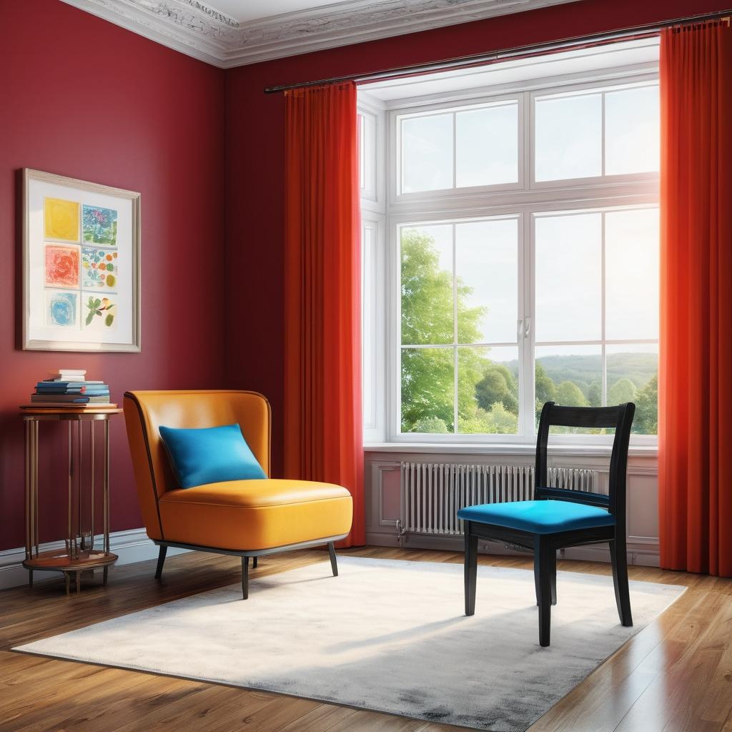 这幅作品主要使用了简单的线条和少量的色彩,描绘了一个房间的内部场景。画面中有一个人物坐在椅子上,周围有一些家具和物品。整体构图较为简单,给人一种随意和轻松的感觉。画面中使用了多种颜色的线条,可能是在传达一种多彩的情绪或氛围。