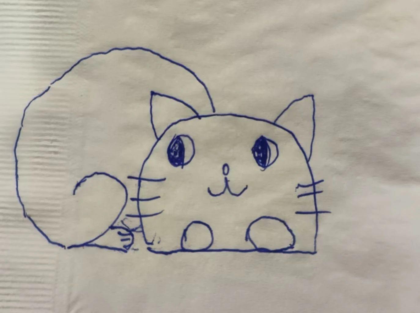 这幅画是一只简单可爱的猫的素描,使用蓝色笔在纸巾上绘制。猫的形象卡通化,带有夸张的大眼睛和卷曲的尾巴。整体风格简约,线条流畅,展现了一种天真和纯粹的情感。
