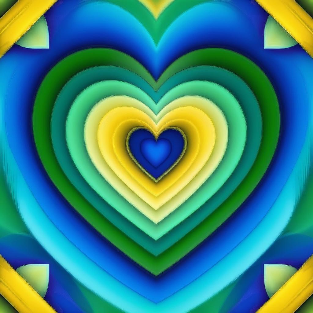 这幅作品呈现了一个多层心形的视觉效果,主要色调为蓝色、绿色和黄色。色彩过渡自然,层次感强烈,流线型的构图给人一种和谐与流动的感觉。图案中心的黄色心形是视觉焦点,传达出一种温暖与希望的情感。整体上,这幅作品可能在探讨爱与和谐的主题。