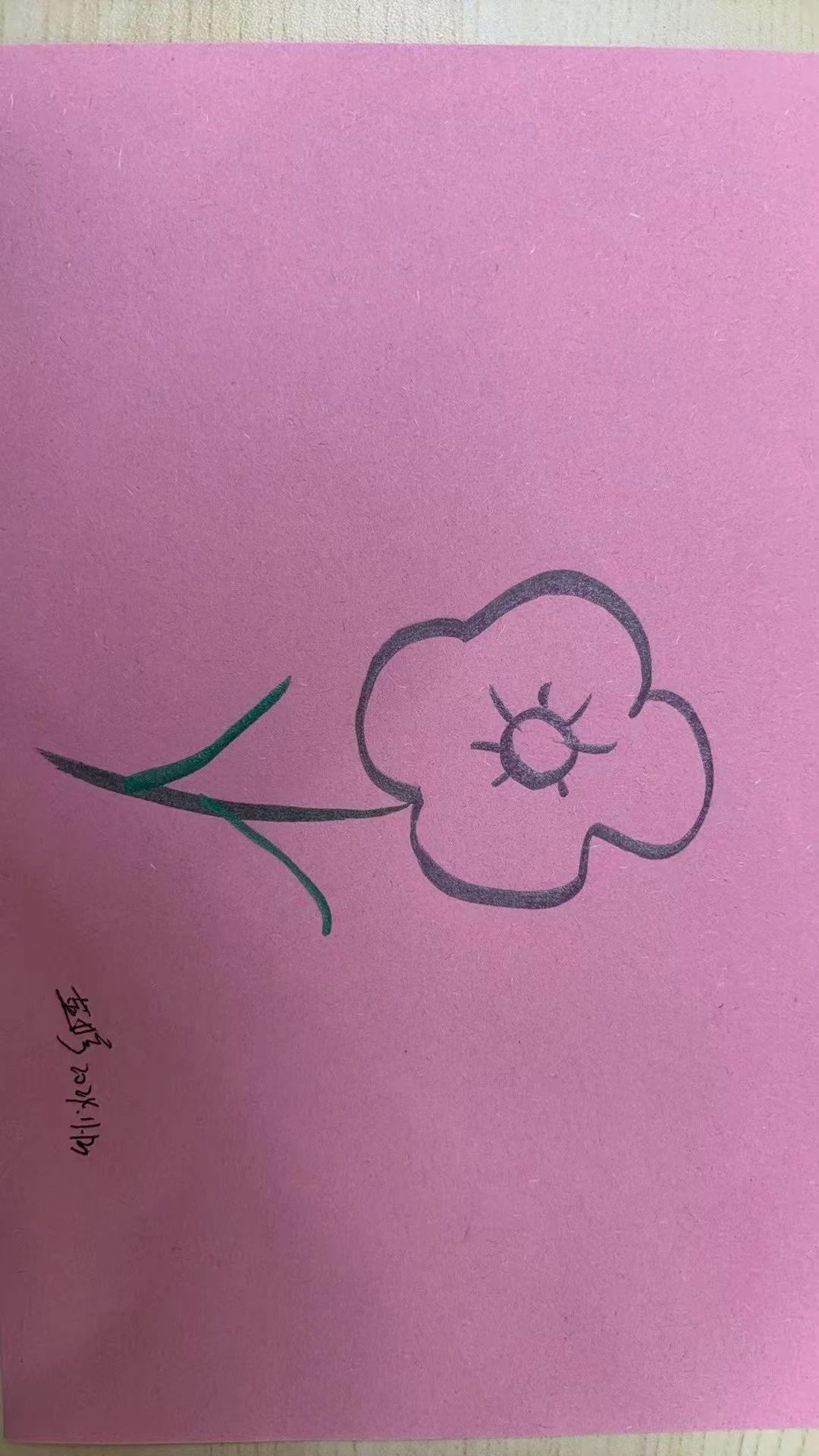 这幅作品展示了一朵简单的花,用黑色线条勾勒出花的轮廓,背景为粉红色纸张。花的设计极为简约,透出一种童真的气息,仿佛是儿童画作。整体色彩搭配柔和,线条简单而有力,传递出一种纯粹和天真的情感。