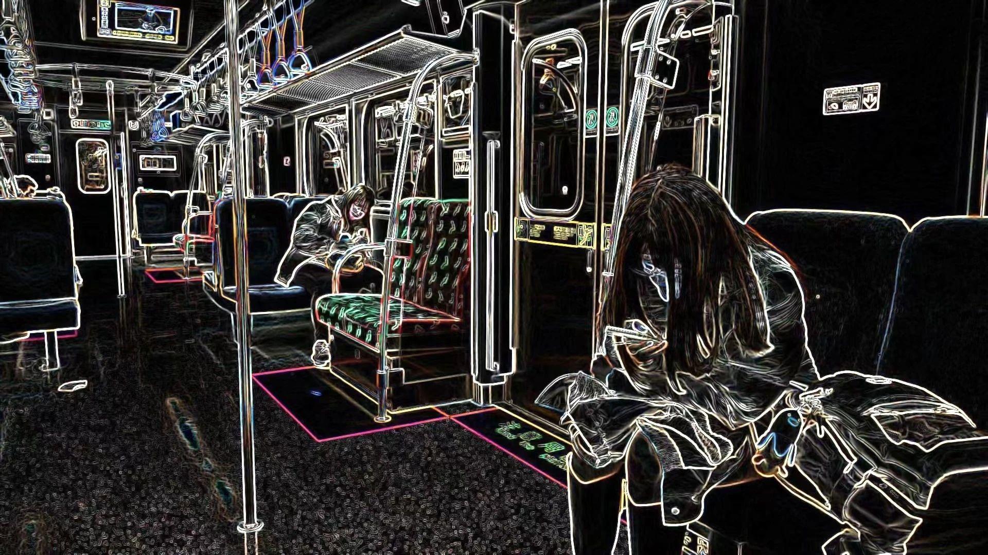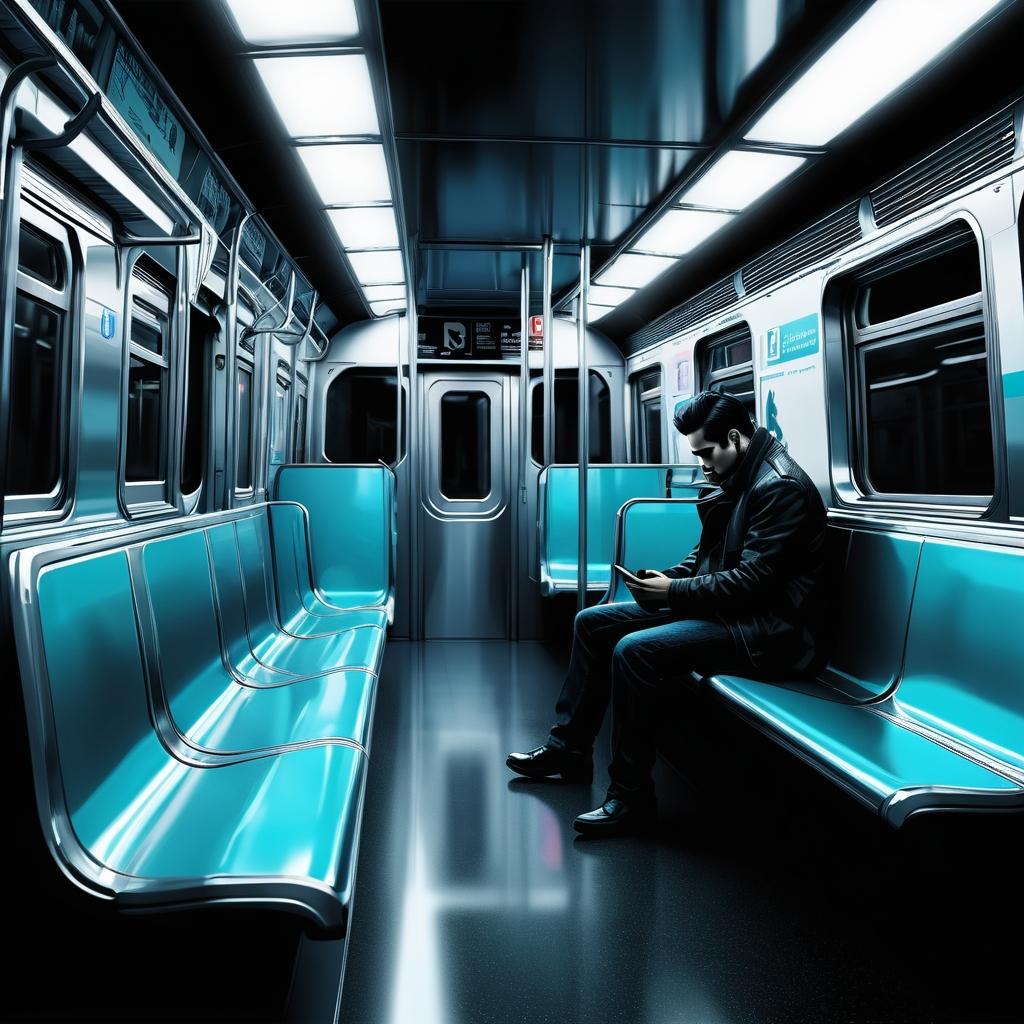 这幅作品以一种独特的霓虹风格描绘了地铁车厢内部。图中人物埋头于手机,营造出一种现代都市生活的孤独感。色彩对比鲜明,线条勾勒出车厢的结构,给人一种超现实的视觉体验。