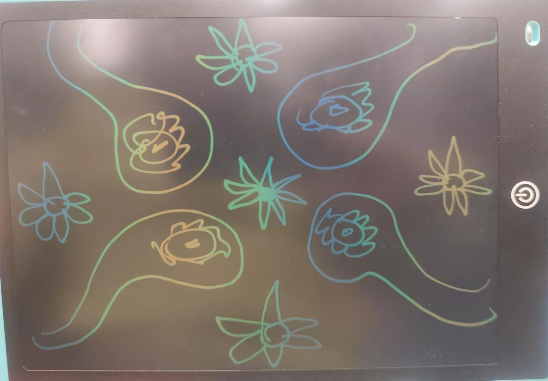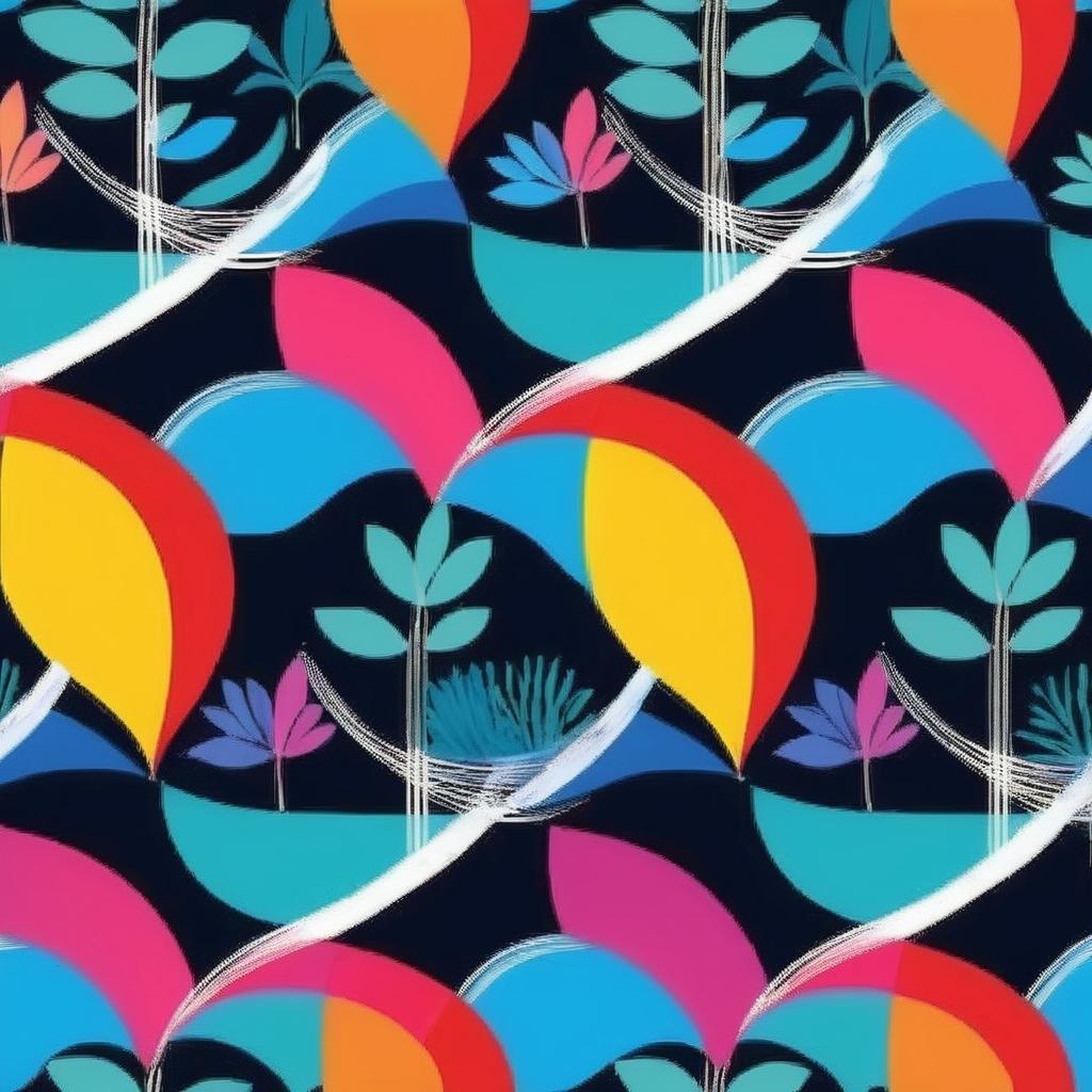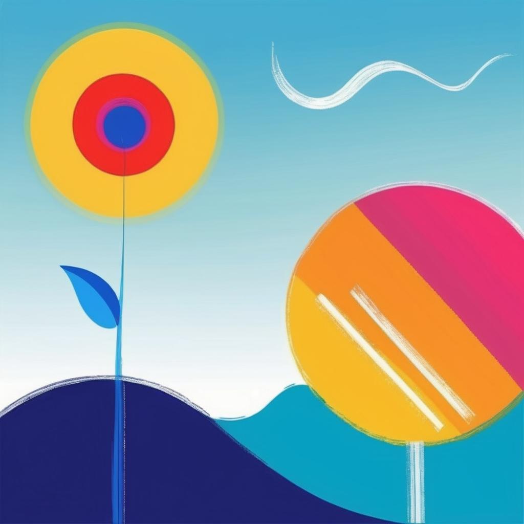 这幅作品以简单的线条和明亮的色彩为主,展现了一种天真烂漫的风格。主要元素包括几何形状的花朵和抽象的、有流动感的形状。整体色调温暖且多彩,给人以轻松愉悦的感觉。创作者可能希望通过这种简约和色彩丰富的画面传达一种童趣和自然的美好。