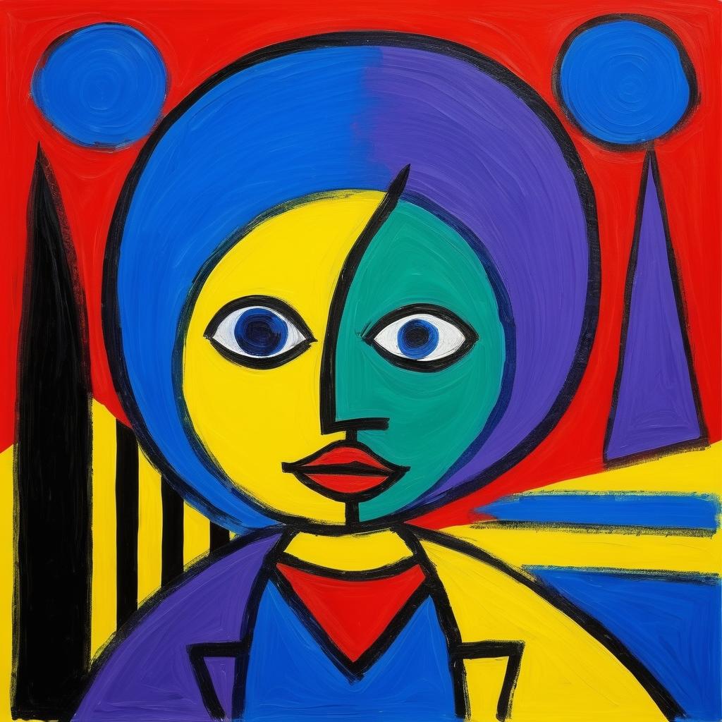 这幅作品使用了简单的线条和鲜艳的颜色,呈现出一种天真和原始的风格。画面中有一个大而夸张的脸部形象,表现出强烈的情绪,可能是愤怒或惊讶。画面上方有一个心形图案,增加了情感元素。整体构图简单直接,充满童趣。