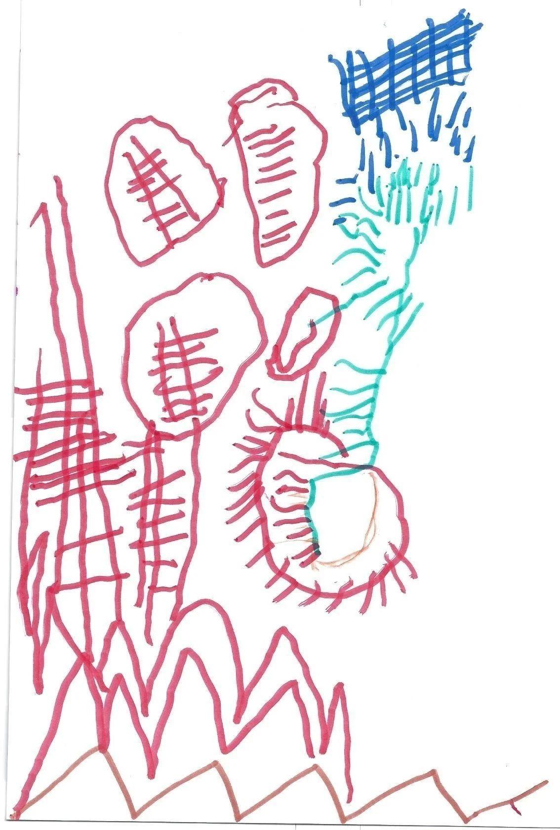 这幅画运用了红色和蓝绿色的线条,形成了一种自由的、不拘一格的构图。线条的排列和交错反映了复健者在康复过程中对手部动作的探索。红色的弧线和直线结合,展示了中风患者在尝试不同力度和方向的握力操作。蓝绿色波纹状的线条似乎表现了ANS神经调节色谱的意图,象征着神经的逐步恢复和健康状态的改善。整体图形有一种动态的几何扩散结构,可能是复健者在逐步尝试复杂动作的表现。中央的圆形图案可能象征着康复的核心目标,周围的线条像是环绕的支持系统。