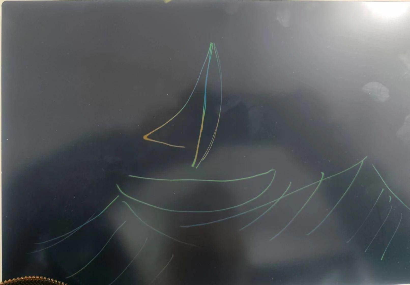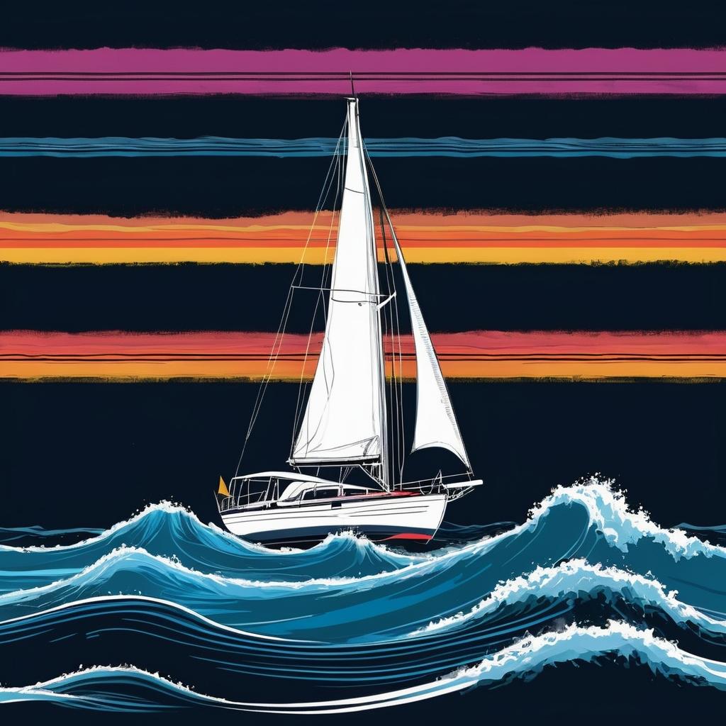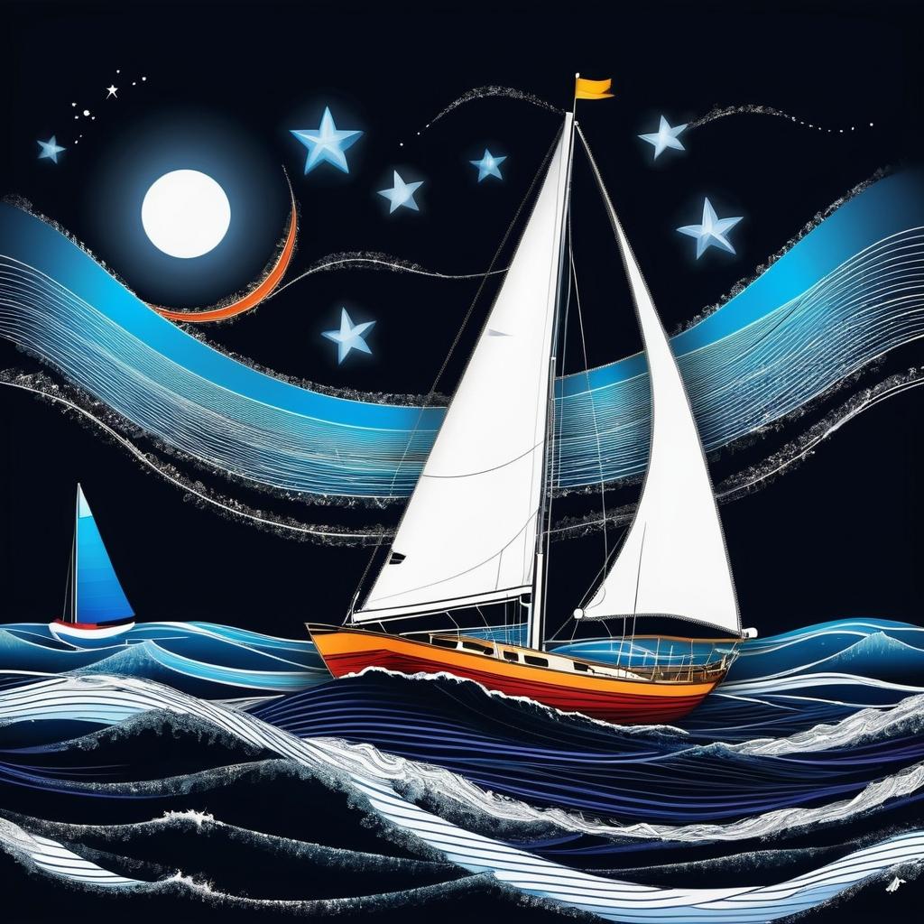 图片呈现了一艘帆船在海面上航行的简洁图像。线条使用了多种颜色,背景为深色,营造出一种宁静的氛围。整个构图简洁而富有童趣,似乎在传达一种冒险与自由的主题。