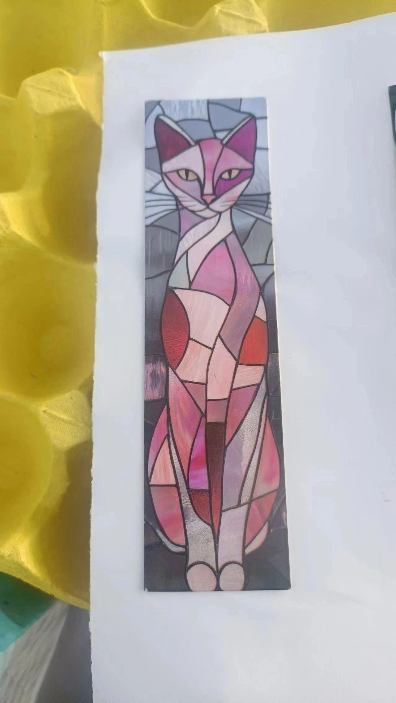 这幅作品通过彩色玻璃风格呈现了一只优雅的猫,整体色调柔和且富有表现力。粉色和紫色的运用使猫的形象显得既温柔又神秘。为了提升作品的艺术性,可以在背景上加入更多细节,比如利用渐变色来增强空间感。此外,可以尝试在猫的眼神中注入更多的情感元素,或是通过更加复杂的线条设计来提升作品的深度。通过这些调整,作品将更加具有视觉冲击力,同时保留其原有的艺术魅力。