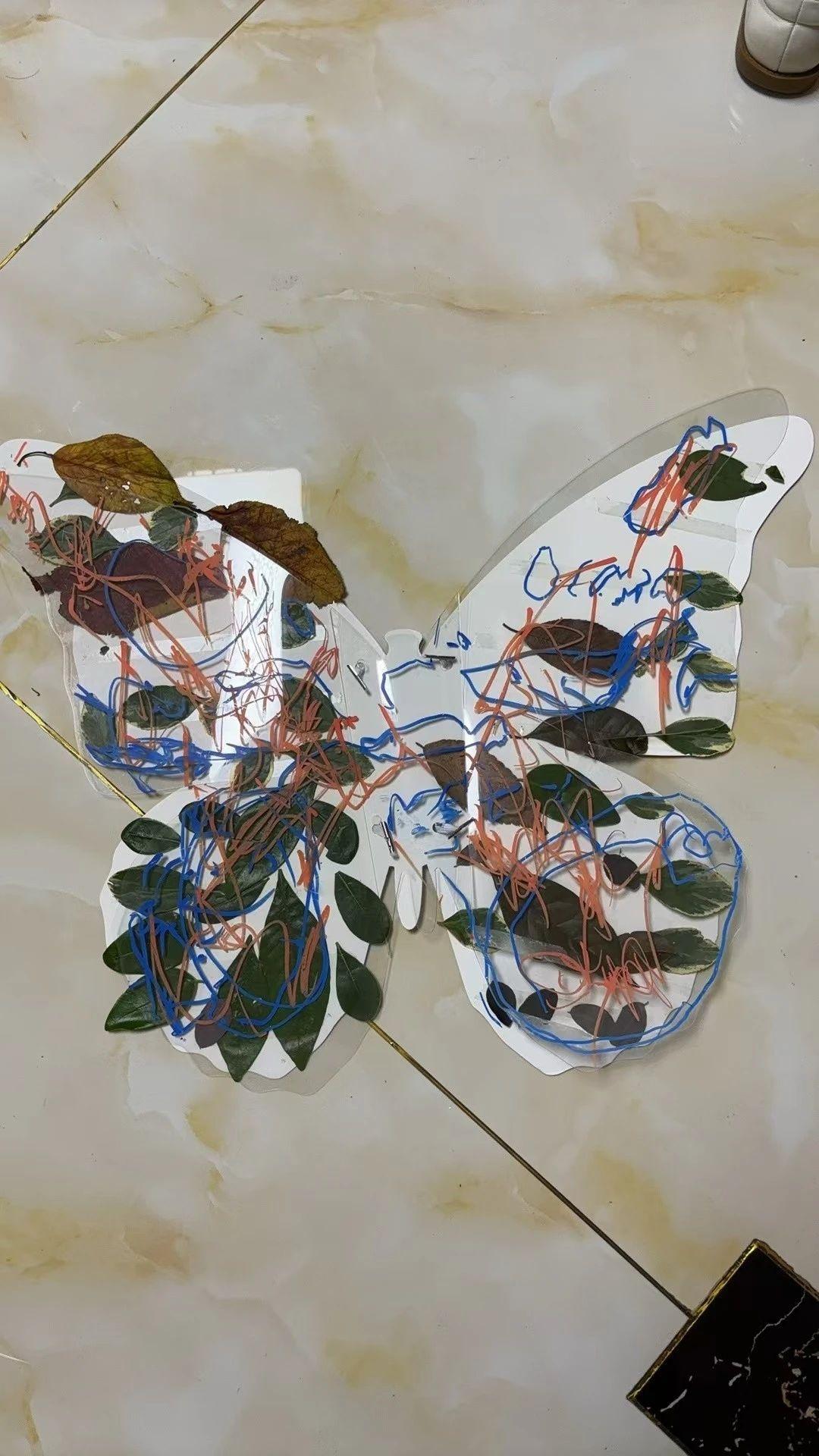 这幅作品呈现出一个由自然元素组成的蝴蝶形象。叶片和干枯的树叶被置于蝴蝶的翅膀上,增加了自然的质感。涂鸦风格的线条(红色和蓝色)覆盖在翅膀上,赋予作品一种活泼且随意的氛围。整个构图在地板上完成,背景简单,与前景形成鲜明对比。创作者可能想通过自然与人为元素的结合来传达对生命和自然的思考。