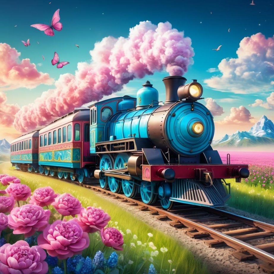 这幅作品展示了一辆复古风格的小火车行驶在花海之中。色彩鲜艳,主要以粉色和蓝色为主,营造出梦幻般的氛围。背景中的云朵和花朵增加了画面的层次感和深度。整体构图简单但充满童趣,传达了一种探索和冒险的主题。