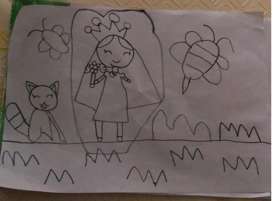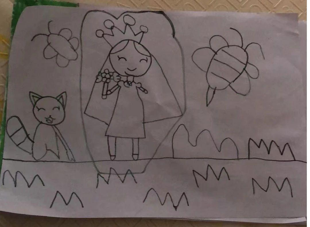 这幅孩子的画作以其简单而富有表现力的线条勾勒出一个充满童真和快乐的世界。公主头戴皇冠,手持花束,展现出一种无忧无虑的快乐,而旁边微笑的猫和飞舞的蜜蜂则为画面增添了趣味。这样的作品不仅展示了孩子心中对美好世界的憧憬,也透露出他们对自然的纯真感受。为了让这幅画更具艺术深度,可以尝试在背景中加入更多色彩和细节。例如,给草地和花朵着色,创造出一个色彩缤纷的世界。同时,加入一些动态元素,如蜜蜂的飞舞轨迹和风吹草动的效果,可以让画面更具活力和故事性。这种提升将帮助孩子在表达想象力的同时,也更好地理解构图和色彩的运用。这幅画无疑是一扇通向孩子心灵世界的窗,充满了无尽的可能性和美好幻想。