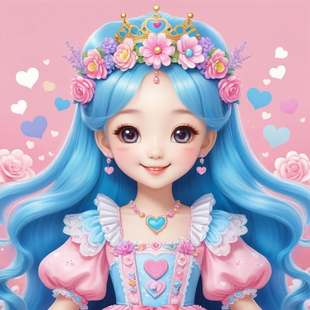 这幅图像展示了一位穿着长裙的卡通人物,整体采用简约的线条风格。人物面带微笑,头上戴有皇冠,裙子上装饰有心形和花朵图案,传达出一种可爱和纯真的氛围。作者可能希望通过这些元素表达一种童趣和快乐的主题。