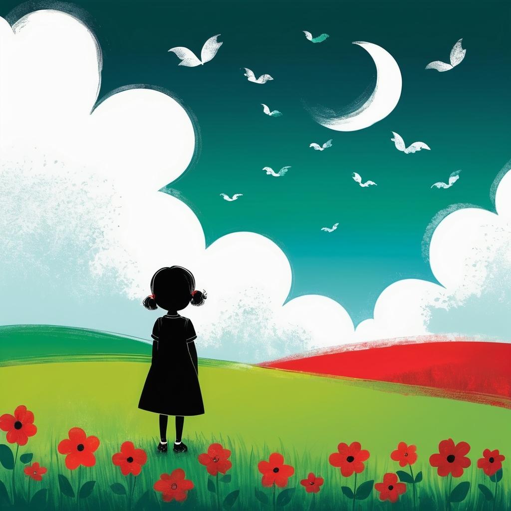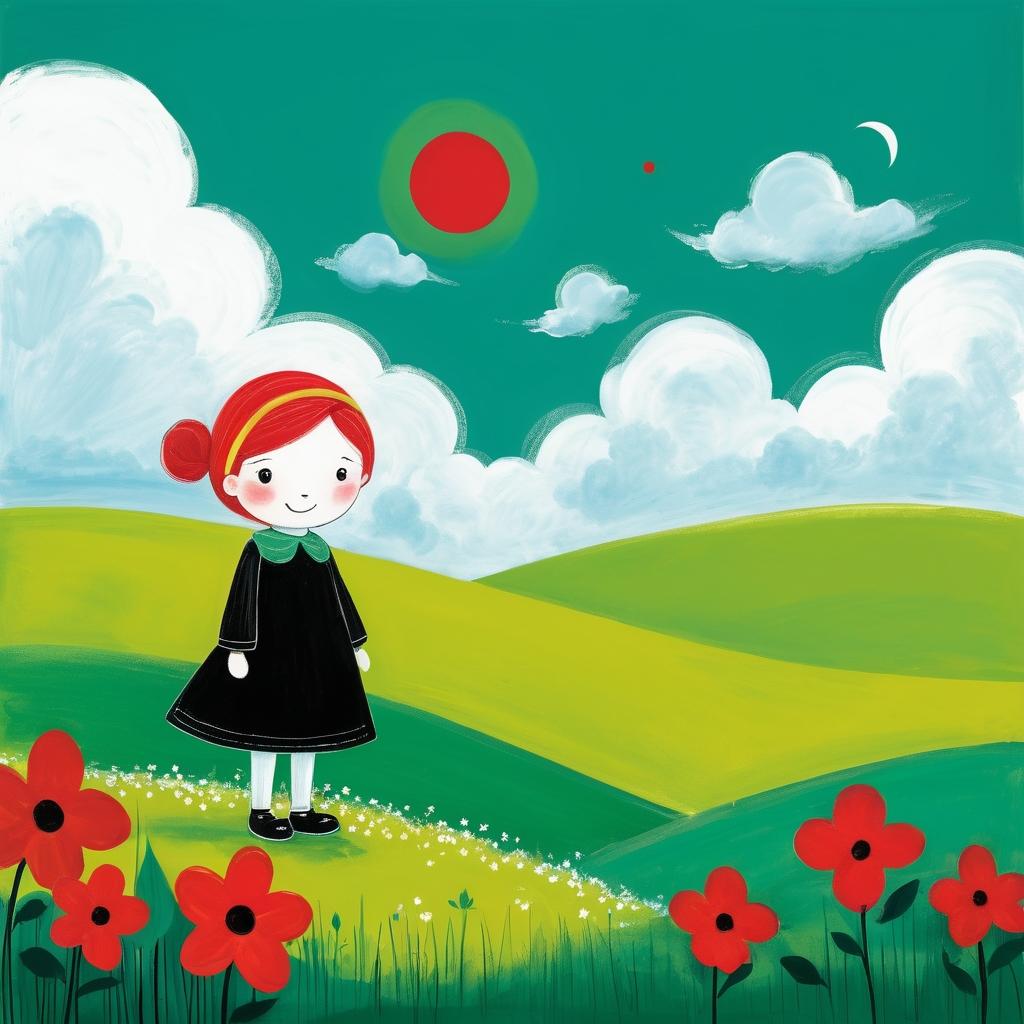 在孩子的绘画世界里,一切都是可能的。这幅作品通过简单而大胆的色彩组合,展现了孩子对世界的理解与表达。画面中的小人身着黑衣,手中似乎握着一团红色的火焰,仿佛象征着梦想与热情。草地上的花朵色彩斑斓,与下方绿色的草地形成鲜明对比,使整个画面充满了活力与生机。这种风格属于儿童艺术中的天真艺术(Naïve Art),以其直接和未加修饰的表现方式而受到喜爱。通过引导孩子在背景中加入更多细节,如天空的颜色变化或云朵的形状,可以让作品更具立体感和故事性。同时,鼓励他们在角色表情和姿态上加入更多细节,以增强人物的生动性。这样的提升不仅能丰富作品的视觉效果,还能帮助孩子在艺术表达中融入更多个人情感,使其作品在儿童艺术领域中更加引人注目。