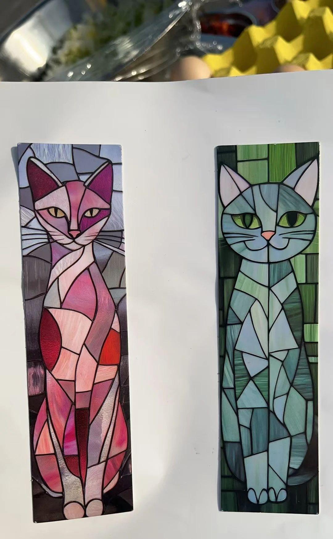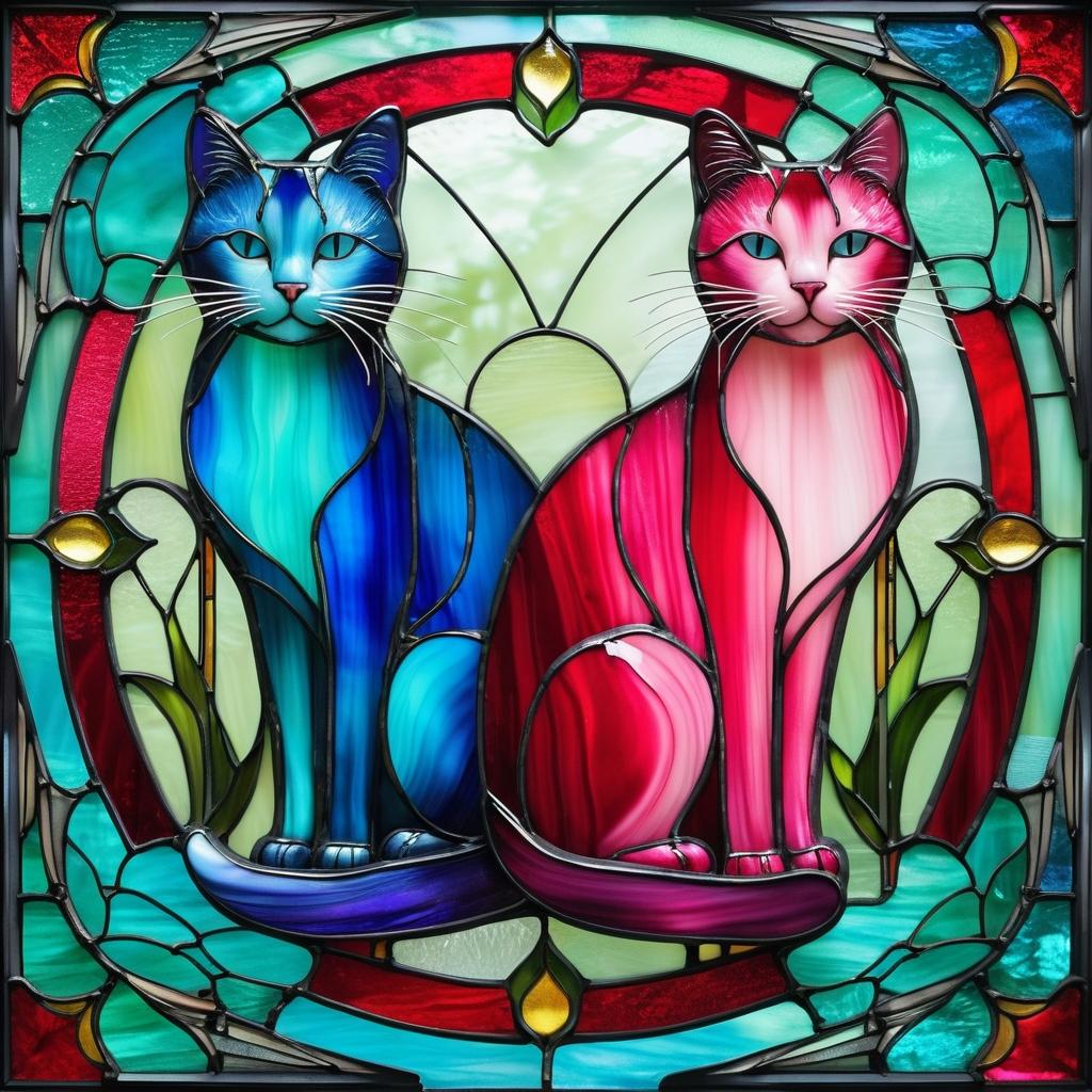 这幅作品展示了两只猫的彩色玻璃艺术设计。左侧的猫采用了粉色和红色为主色调,传达出柔和而温暖的情感。右侧的猫则使用绿色和蓝色为主色调,给人一种清新和宁静的感觉。整个构图对称且平衡,颜色搭配和谐,体现了艺术家对色彩和形式的敏锐感知。