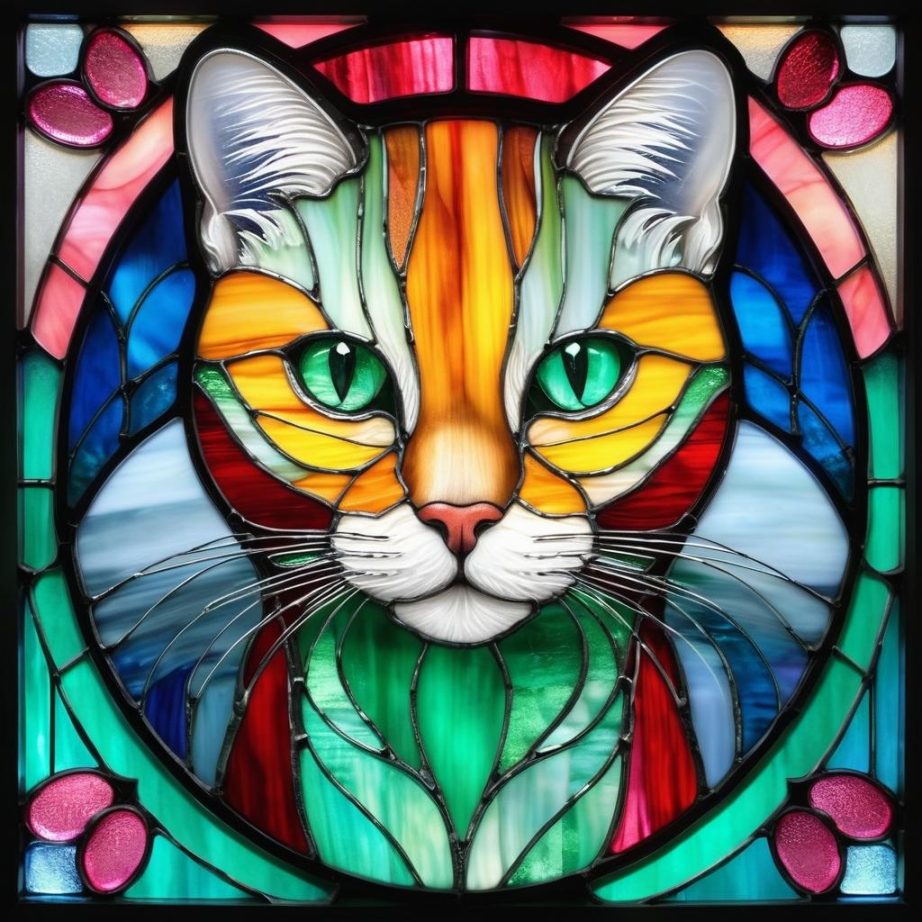 这幅作品将猫的形象与彩色玻璃艺术巧妙结合,形成了一种独特的视觉体验。左侧猫的粉色和红色色调让人联想到温暖的阳光和活力的生命力,而右侧猫的绿色和蓝色则让人感受到自然的宁静与安详。通过这种色彩的对比,艺术家不仅展现了对猫这一主题的不同理解,也让观众在欣赏时感受到情感的流动和变化。这种艺术形式源于19世纪末的艺术新风格运动,以其流畅的线条和丰富的色彩组合而著称。艺术家可以通过在背景中加入更多细节,或者在玻璃的质感上增加层次感,使作品在视觉上更加丰富。此外,光影效果的引入将使作品在不同光线下展现出更多的变化和魅力,赋予其更强的艺术生命力。