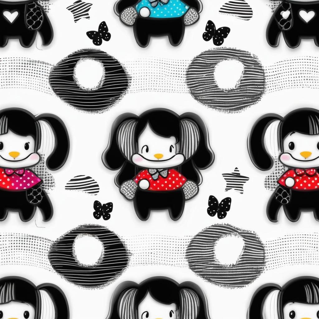 这幅作品是一幅手绘的卡通风格人物剪纸,背景为纹理独特的圆形图案。人物形象简单,线条流畅,服装上有圆点装饰。整体色调较为单一,主要是黑白对比,给人以天真、纯粹的感觉。