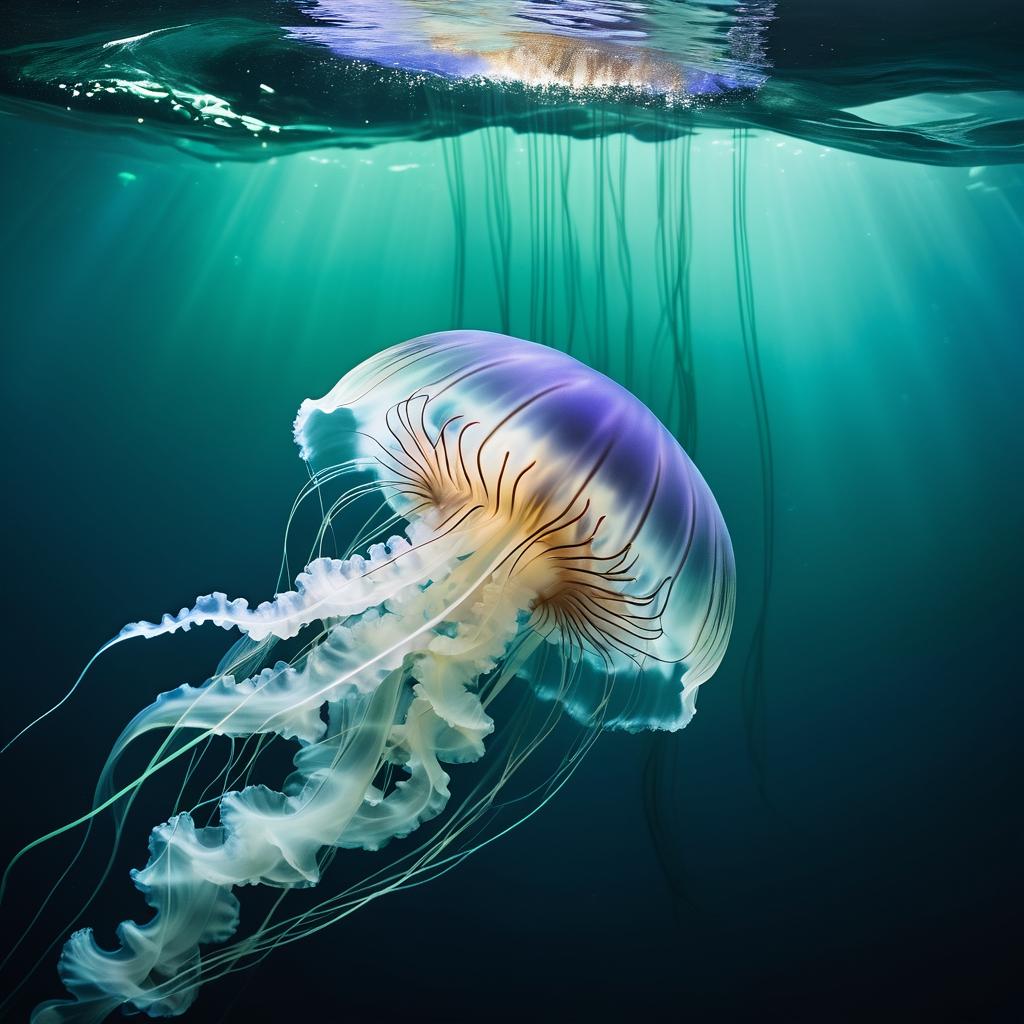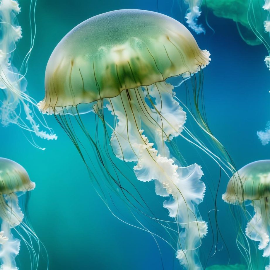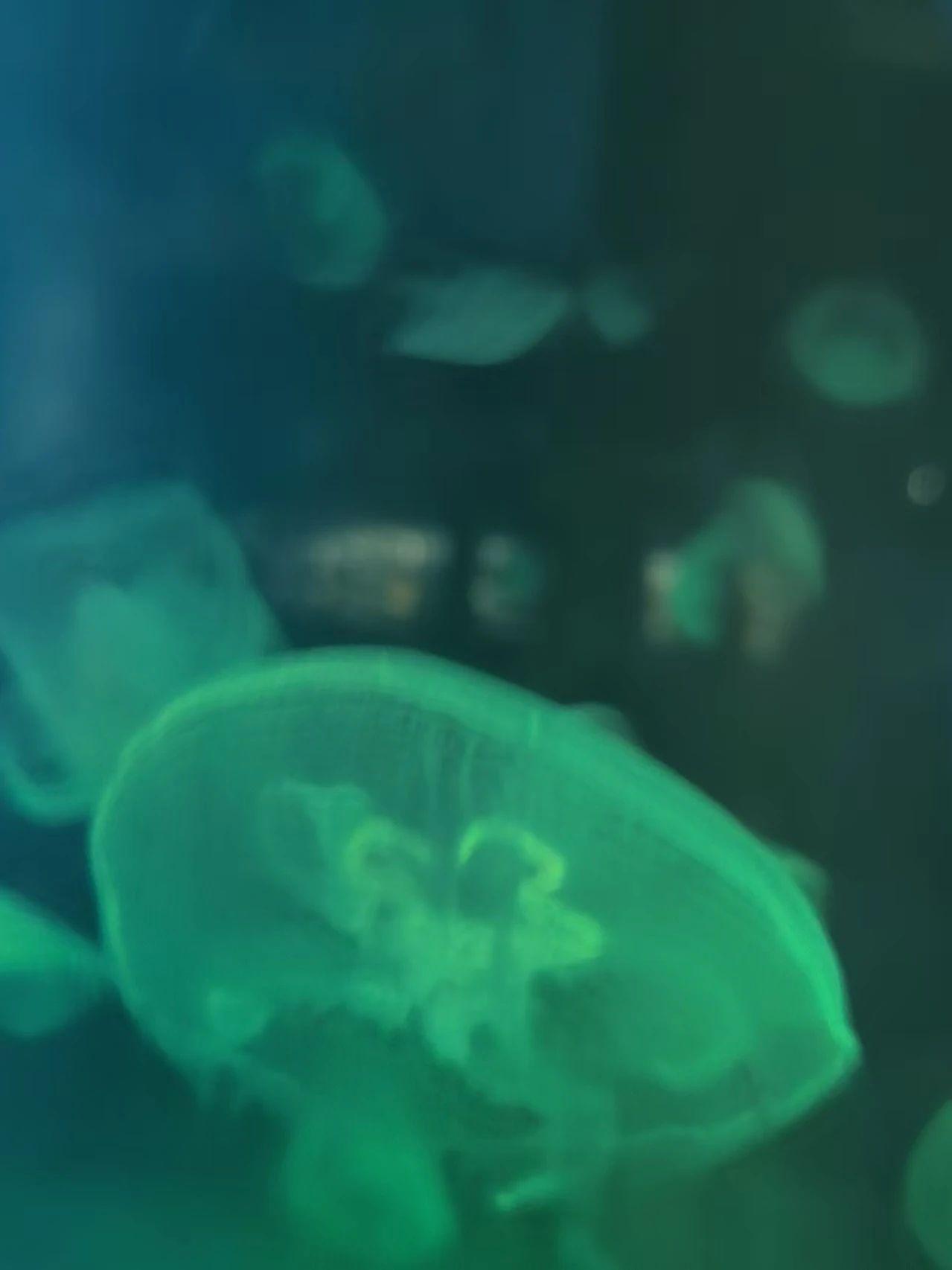 这幅作品主要呈现了水母在水中的柔和之美。绿色和蓝色的色调营造出一种宁静和神秘的氛围。模糊的背景和半透明的水母形成了明显的对比,增强了画面的深度感。创作者可能尝试传达自然界中的和谐与细腻之美。