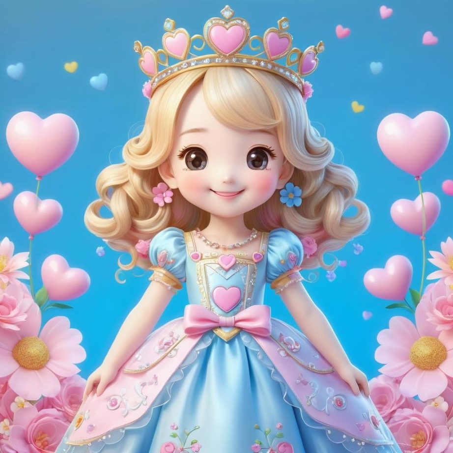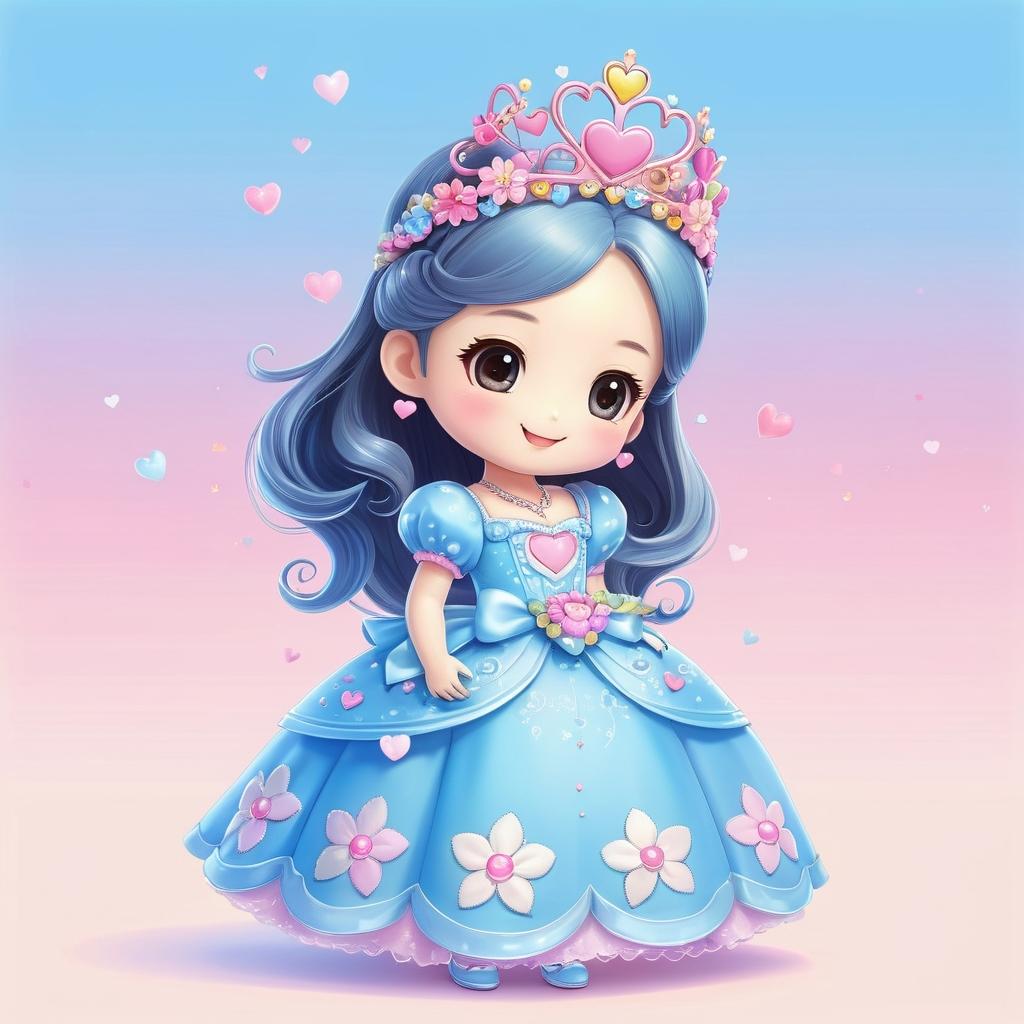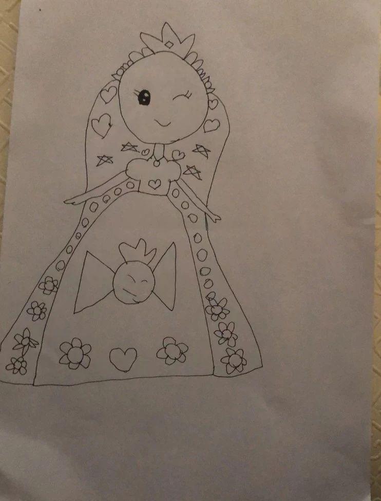 这幅图像展示了一位穿着长裙的卡通人物,整体采用简约的线条风格。人物面带微笑,头上戴有皇冠,裙子上装饰有心形和花朵图案,传达出一种可爱和纯真的氛围。作者可能希望通过这些元素表达一种童趣和快乐的主题。
