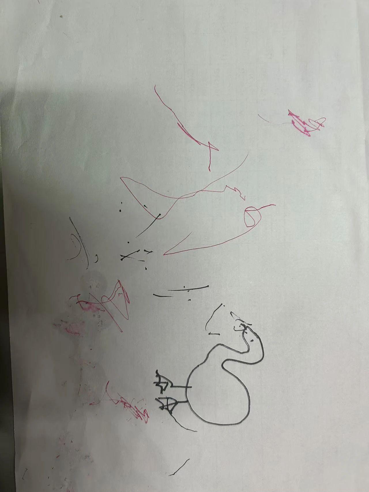 这幅作品表现了孩子在纸上随意涂鸦的过程,体现了他们无拘无束的想象力。可以通过增加背景元素来丰富画面,例如添加一些自然景观或其他动物元素,来进一步激发故事性和互动性。通过引入更多的色彩和细节,作品可以更具吸引力和表现力。将这种无规则的线条转化为更具体的形象,如融入更多生动的鸟类姿态和周围环境,可以使作品更具深度和情感共鸣。