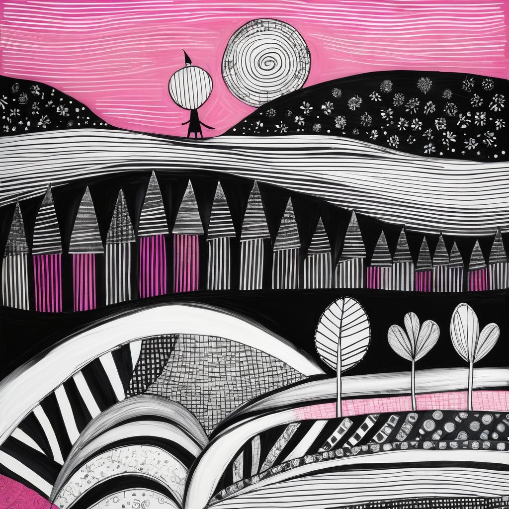 这幅作品主要由简单的线条和几何形状组成。以黑色和粉红色的笔触为主,构图随意且充满童趣。线条的自由流动和不规则的形状传达了一种纯真和探索的情感。画面中可能传达的主题是儿童的想象力和创造力。