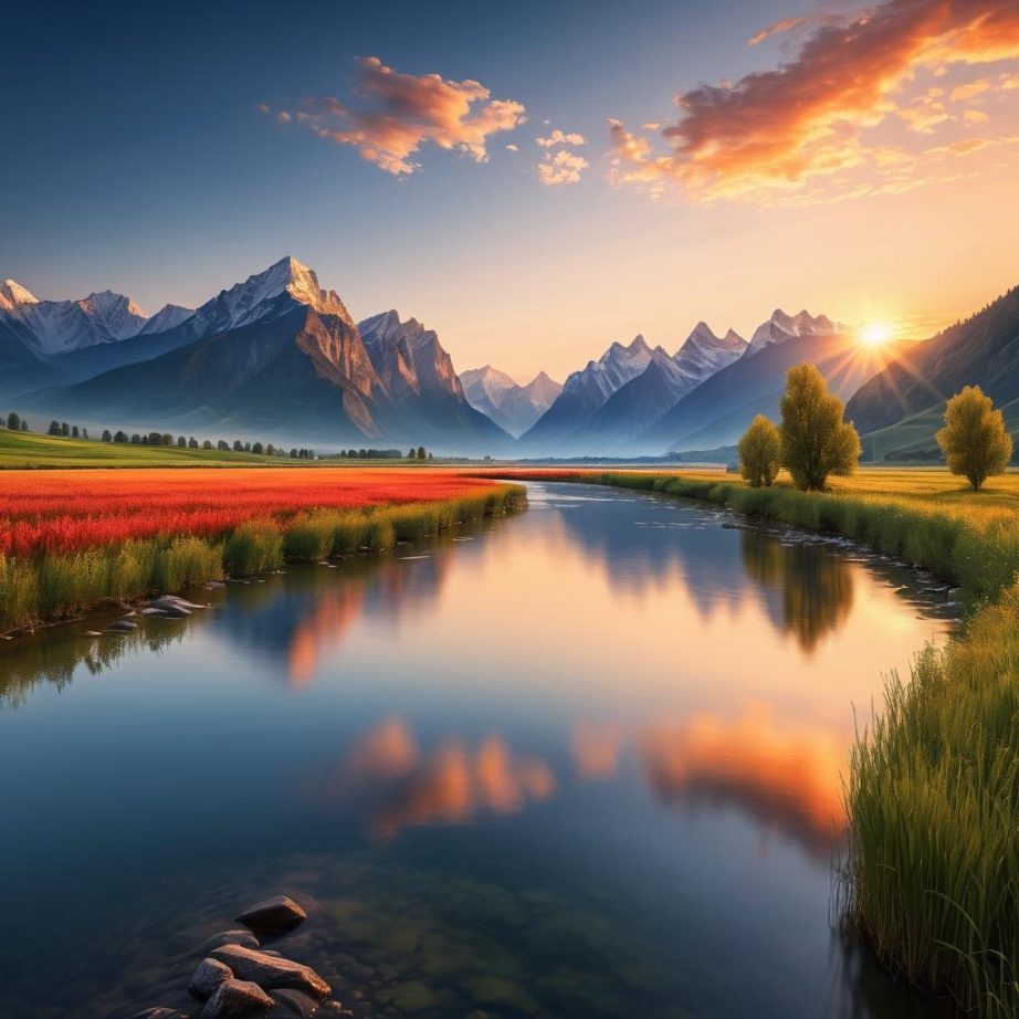 这幅作品描绘了一处宁静的河谷景观,背景是连绵起伏的山脉,夕阳的光线洒在山坡上,形成柔和的阴影和明亮的色调。水面平静,反射出天空的颜色,给人一种平和与宁静的感觉。创作者可能想传达自然环境的宏伟和宁静之美。