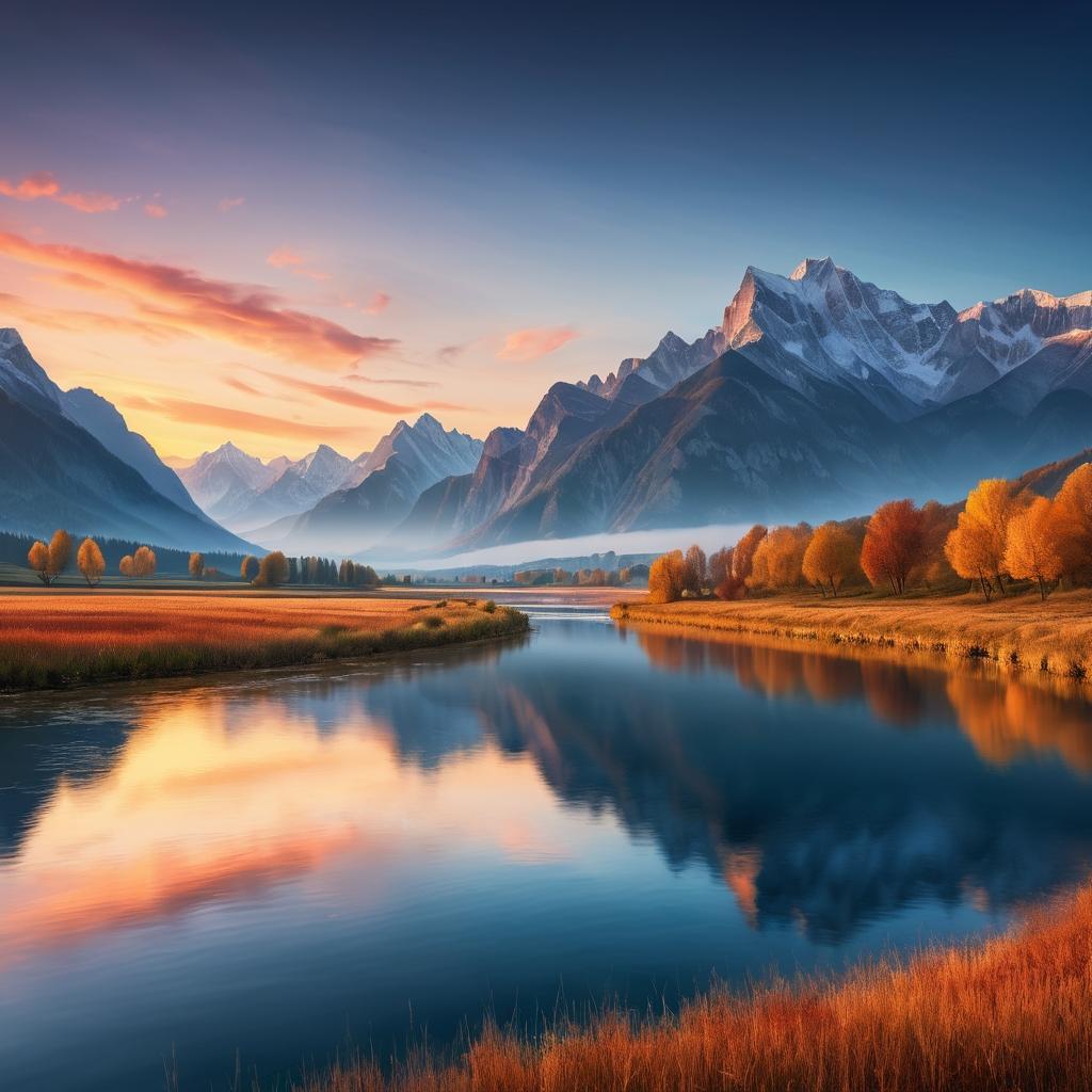 这幅描绘宁静河谷的作品,通过柔和的光影和色彩对比,展现了自然风光的宏伟与宁静。画面中连绵的山脉和平静的水面,营造出一种祥和的氛围。创作者运用了细致的色彩变化,使得每一处细节都充满了生命力。夕阳的暖光洒在山坡上,不仅突显了地形的复杂性,也为整幅画增添了一层温馨感。在这片自然的怀抱中,观者仿佛也能感受到一丝宁静与安逸。