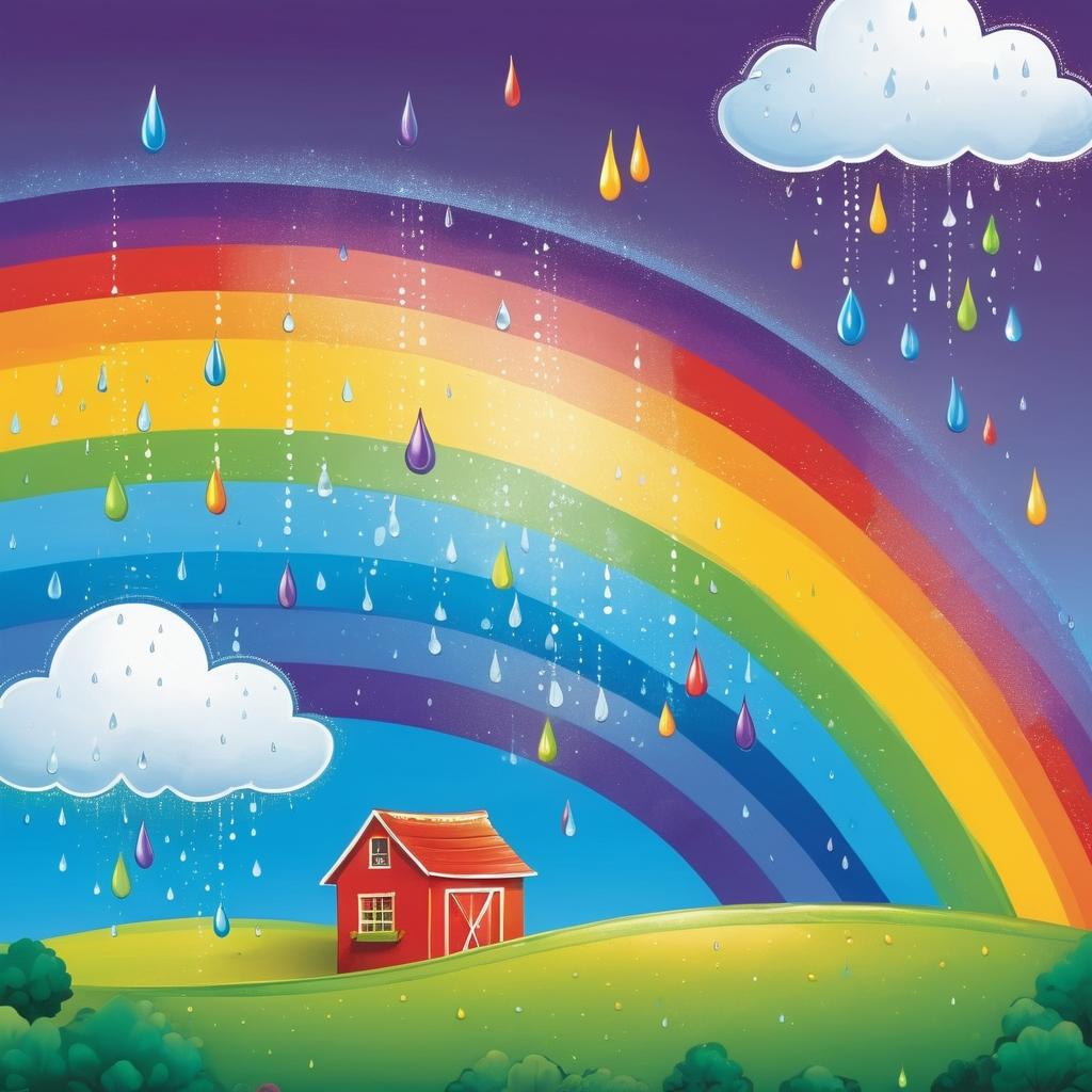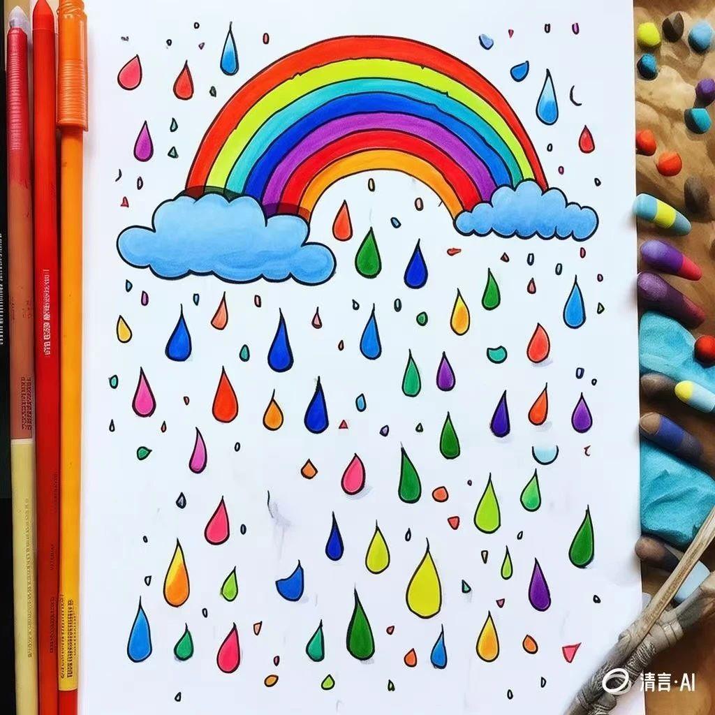 在儿童艺术作品中,色彩和简单的形状常常被用来激发创造力和想象力。这幅作品通过一座彩虹和许多色彩斑斓的雨滴,成功地传达了一种欢乐和童趣的氛围。彩虹作为希望和美好的象征,搭配上活泼的雨滴,构成了一个充满活力的画面。作品中的色彩运用十分大胆,红、橙、黄、绿、蓝、紫交织在一起,形成了一种视觉上的盛宴。为了进一步提升这幅作品的艺术性,可以尝试在背景中增加一些轻柔的云彩,以及通过渐变色来丰富天空的层次感。此外,可以通过细腻的光影效果使彩虹更加立体,甚至在画中加入小动物或人物形象,与彩虹和雨滴互动,增强画面的故事性和趣味性。这样的细节不仅可以增加作品的深度,还能让观众感受到更多的情感共鸣。