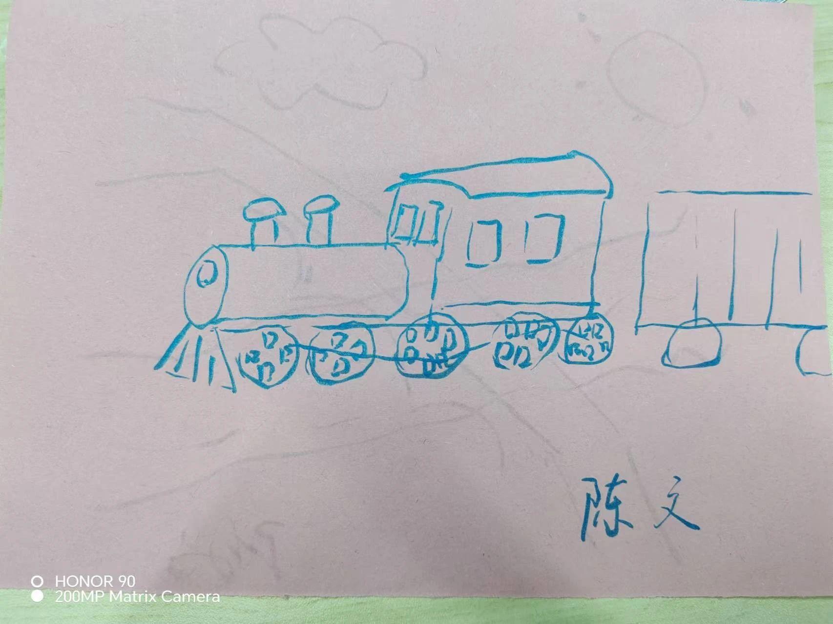 此外,使用更丰富的色彩和阴影可以使画面更具层次感。为火车的不同部分使用不同的颜色,可以增强其视觉冲击力,使其在观赏者心中留下深刻印象。通过这样的方式,画作不仅能保持其原有的童真,还能在艺术性和表现力上得到提升。这幅画作展示了儿童艺术的独特魅力,也提醒我们用纯真的眼光去看待和感受生活中的美好。