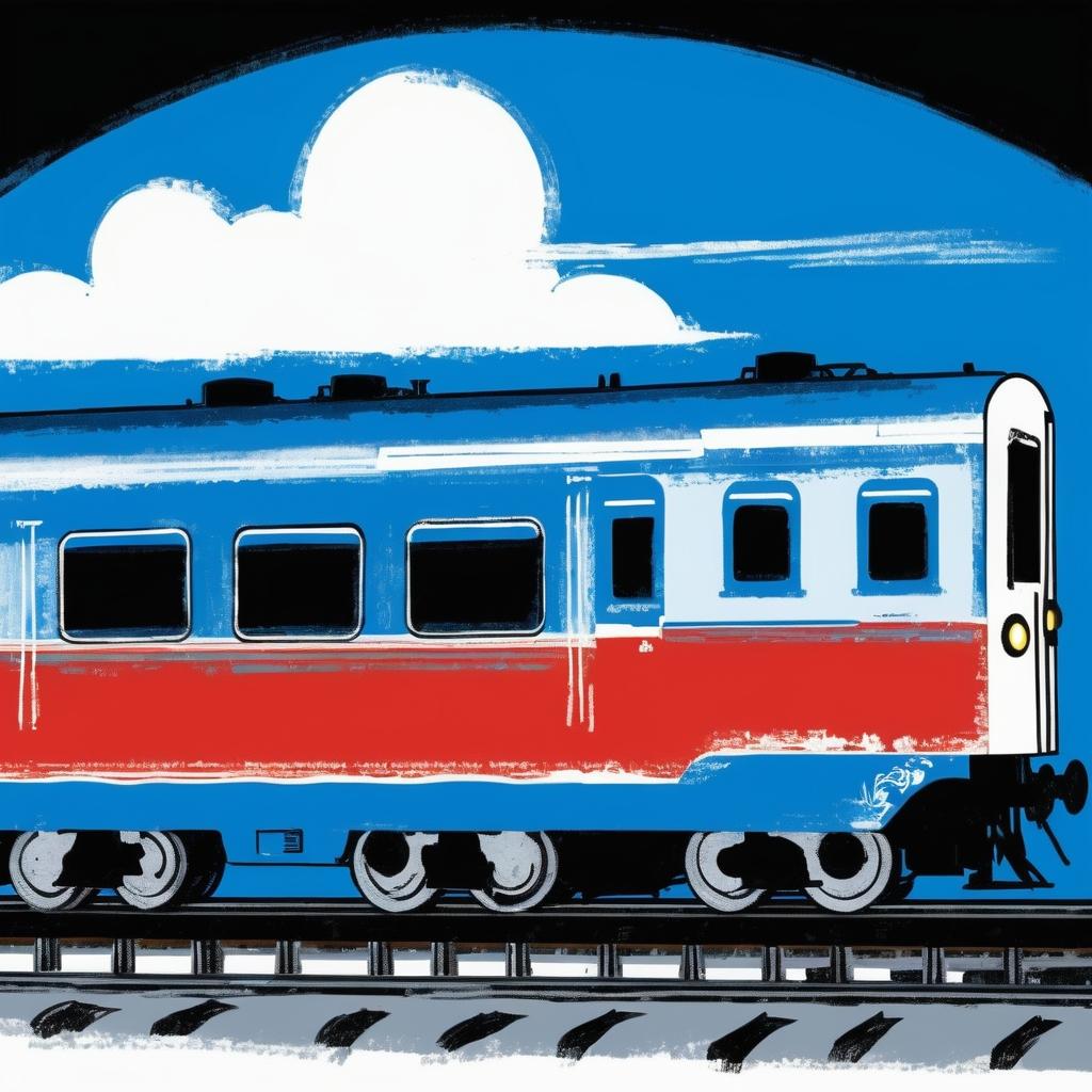 这幅简单而富有童趣的画作,以蓝色为主色调,描绘了一列火车的形象。通过简单的线条和形状,创作者成功地展现了火车的轮廓,而背景中若隐若现的云和山则为画面增添了一丝梦幻的感觉。这种简约的风格充满了想象力和创造力,反映了儿童对世界的独特视角和兴趣。