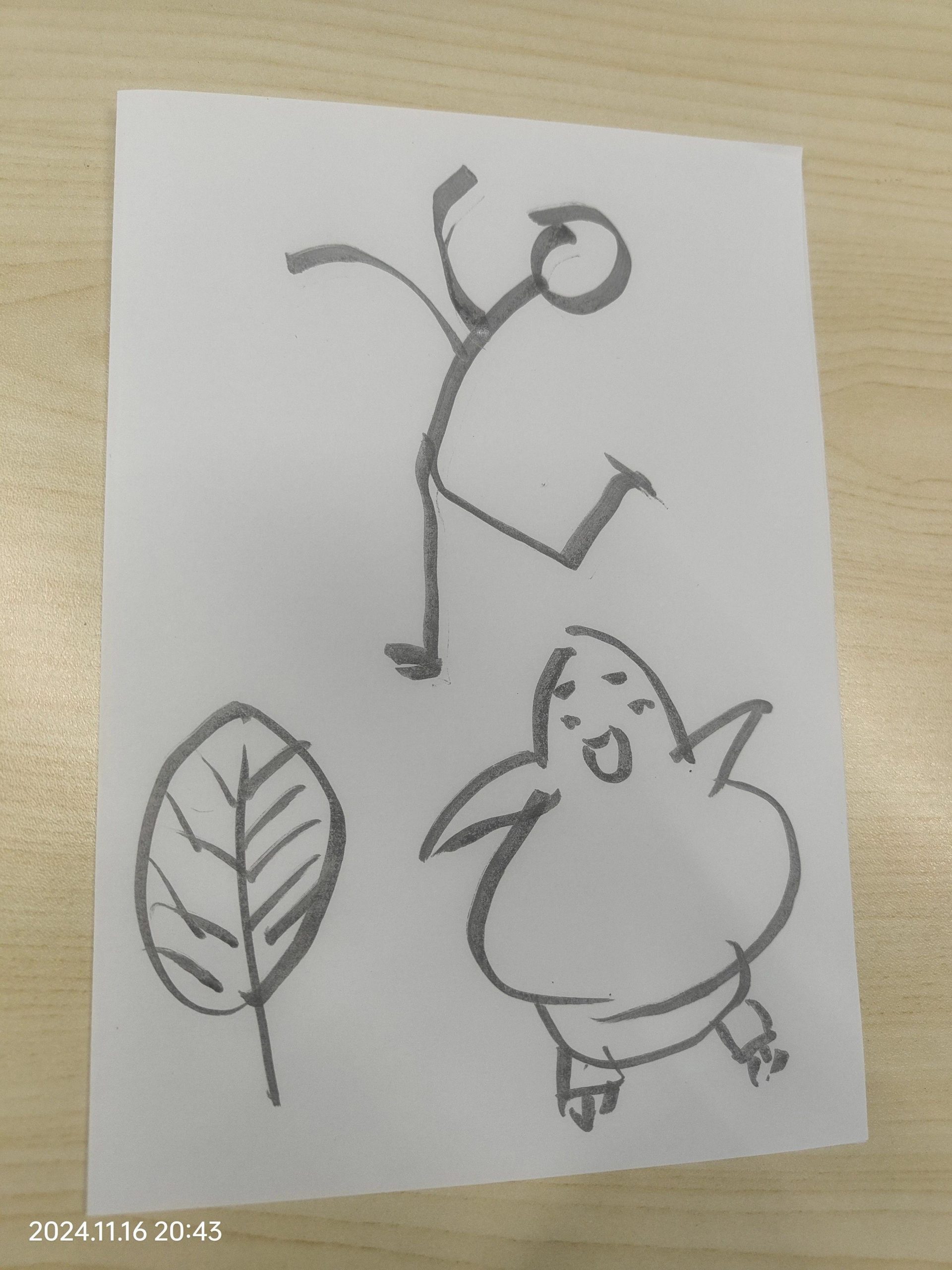 这幅作品由三个主要元素构成:一个跳跃的人形、一个带着笑容的卡通形象,以及一片树叶。整体使用简单的黑色线条勾勒,呈现出一种简约而愉悦的氛围。创作者可能希望表达一种轻松和自然的生活态度,以及对简单事物的热爱。