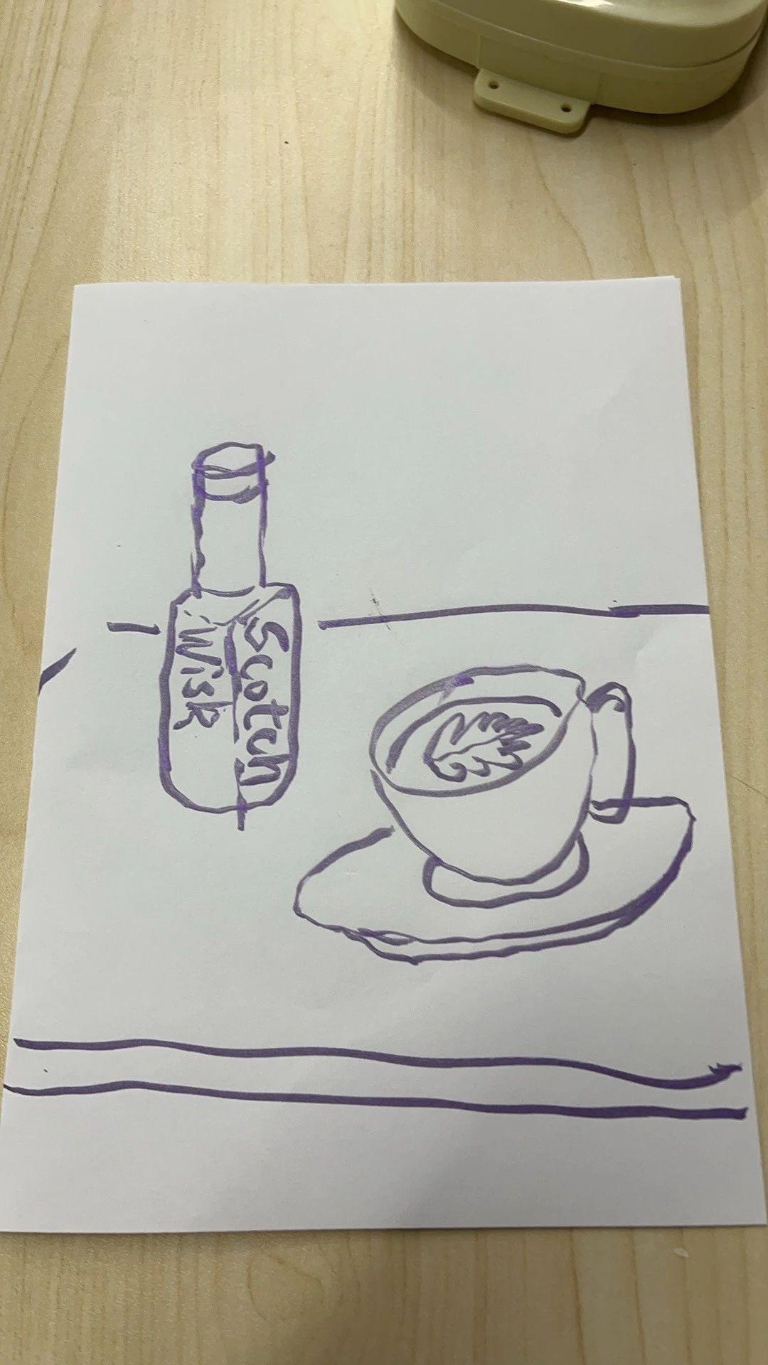 这幅图画使用简单的线条勾勒出一瓶标有’Scotch Whisky’的酒和一杯带有拉花的咖啡。构图简洁,对比明显,呈现出一种居家或咖啡馆的舒适氛围。作者可能在传达一种关于生活中小乐趣的主题,通过酒和咖啡的组合展现出一种日常的轻松感。