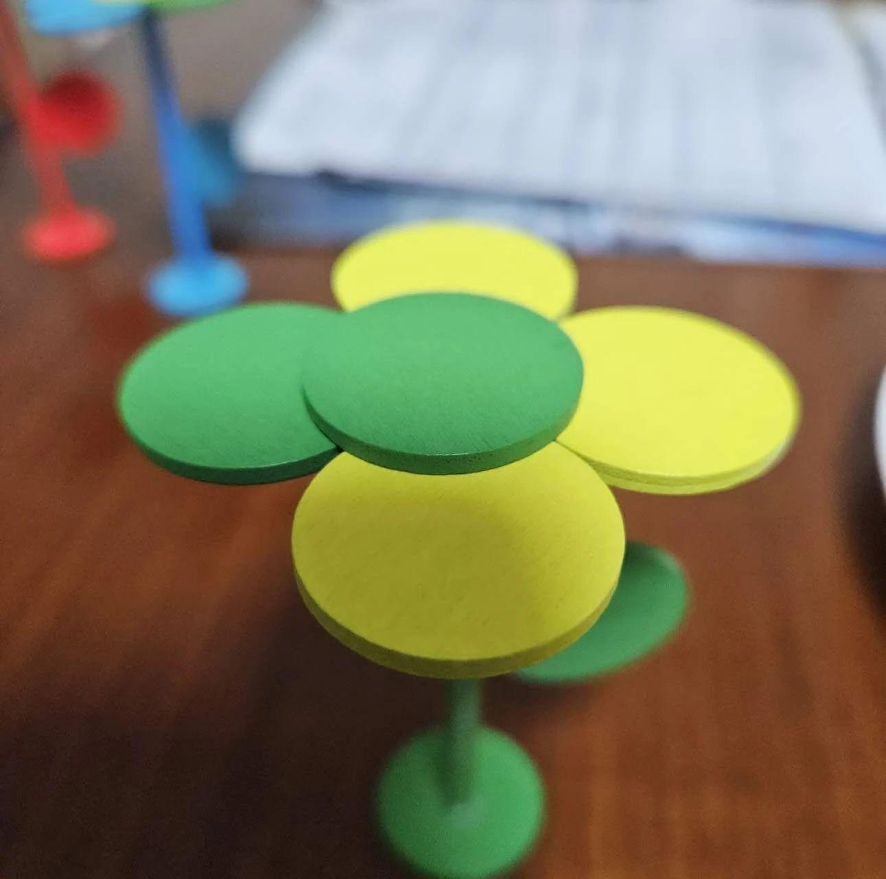 这幅作品中主要元素是由绿色和黄色的圆形板块构成的图案,排列成类似花朵的形状。色彩鲜明,背景模糊,突出前景的立体结构。整体给人一种简单而富有童趣的感觉,可能传达了一种纯真和游戏的主题。