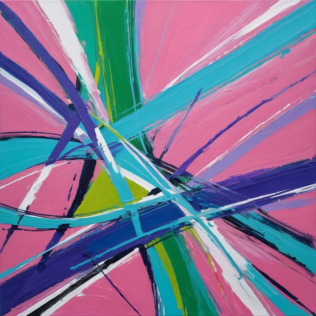 这幅作品使用了粉紫色的背景,上面覆盖着各种颜色的线条,如绿色、蓝色和紫色。线条随意且富有动感,具有强烈的即兴创作风格。这幅作品可能表达了一种自由和无拘无束的情感,通过不规则的线条传达出一种能量和动态感。