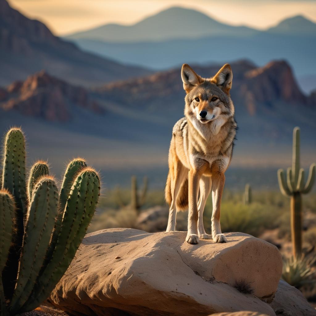在这幅作品中,我们看到一只郊狼静静地站立在沙漠环境中的岩石上,背景中稀疏的仙人掌和荒凉的地貌诉说着这片土地的严酷和生命的顽强。摄影师通过精心的构图和自然的色调捕捉到了这种野性与孤独的交织。郊狼的姿态显得沉稳而自信,仿佛是这片土地的守护者。