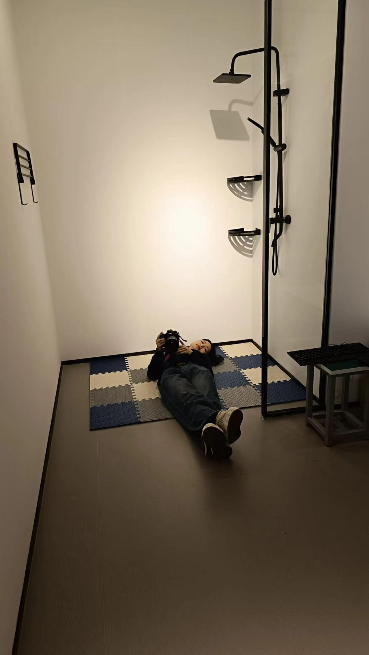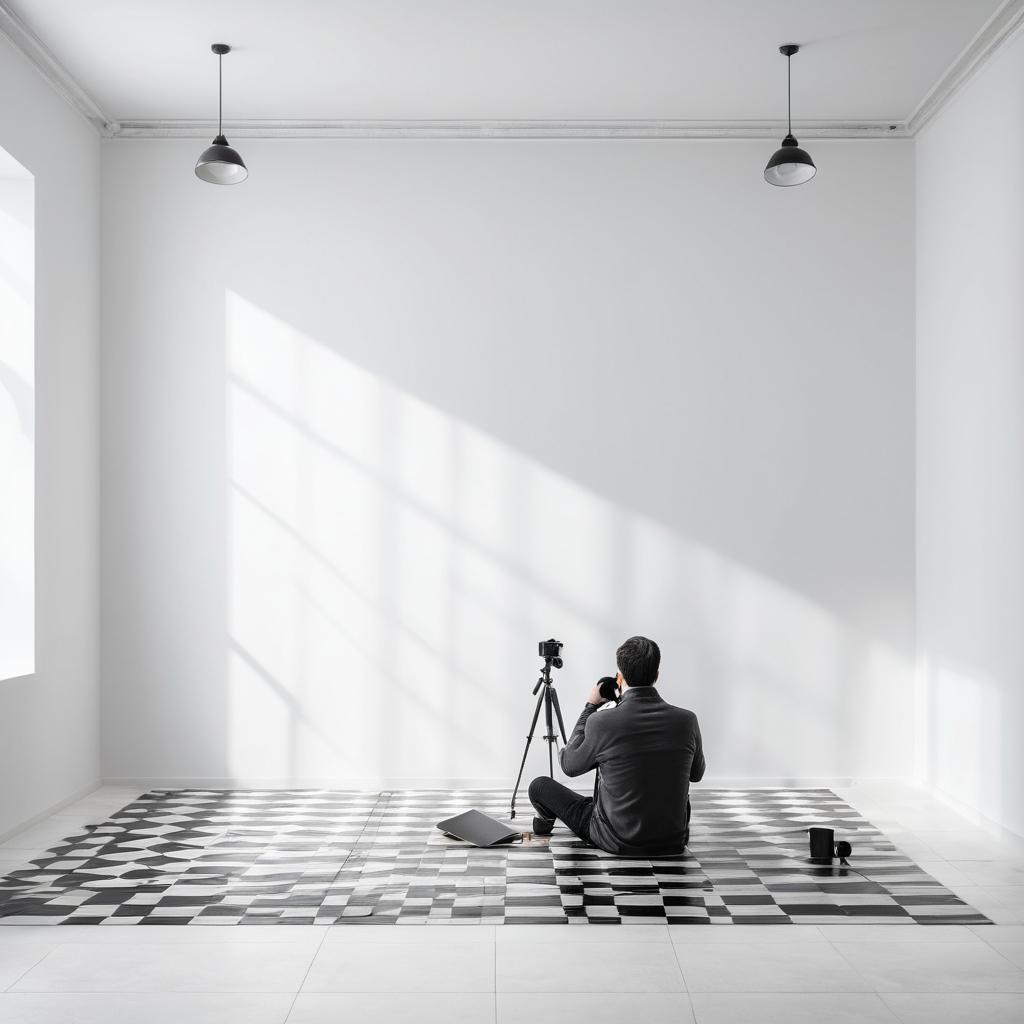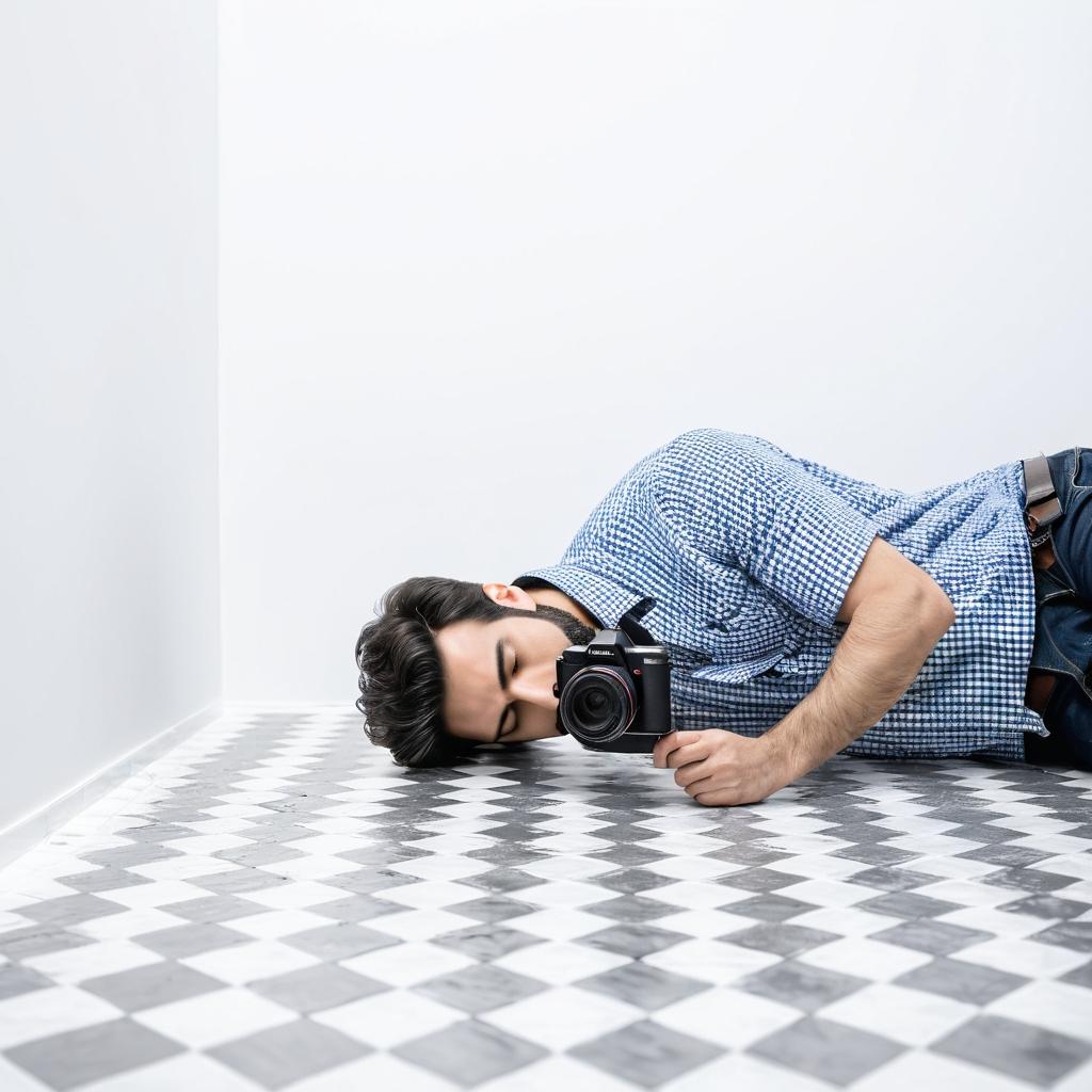 这幅作品展示了一位摄影师躺在地板上,手持相机,背景是一面白色的墙,墙上装有简单的淋浴装置。整个画面采用了极简主义风格,墙面与地板的颜色形成对比,摄影师的姿态显得随意且放松。光影效果强调了墙面的纹理和摄影师的存在感,似乎在传达一种对空间和个人状态的思考。