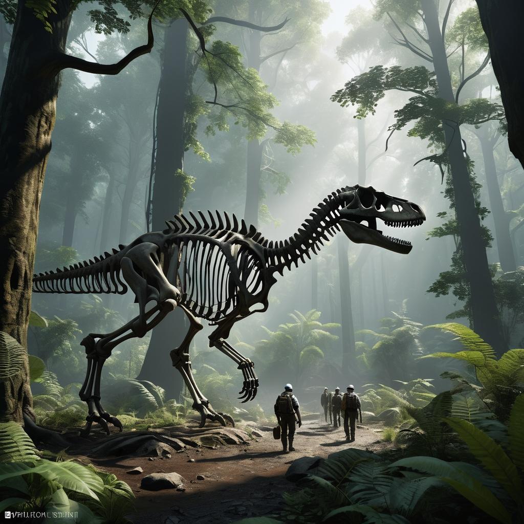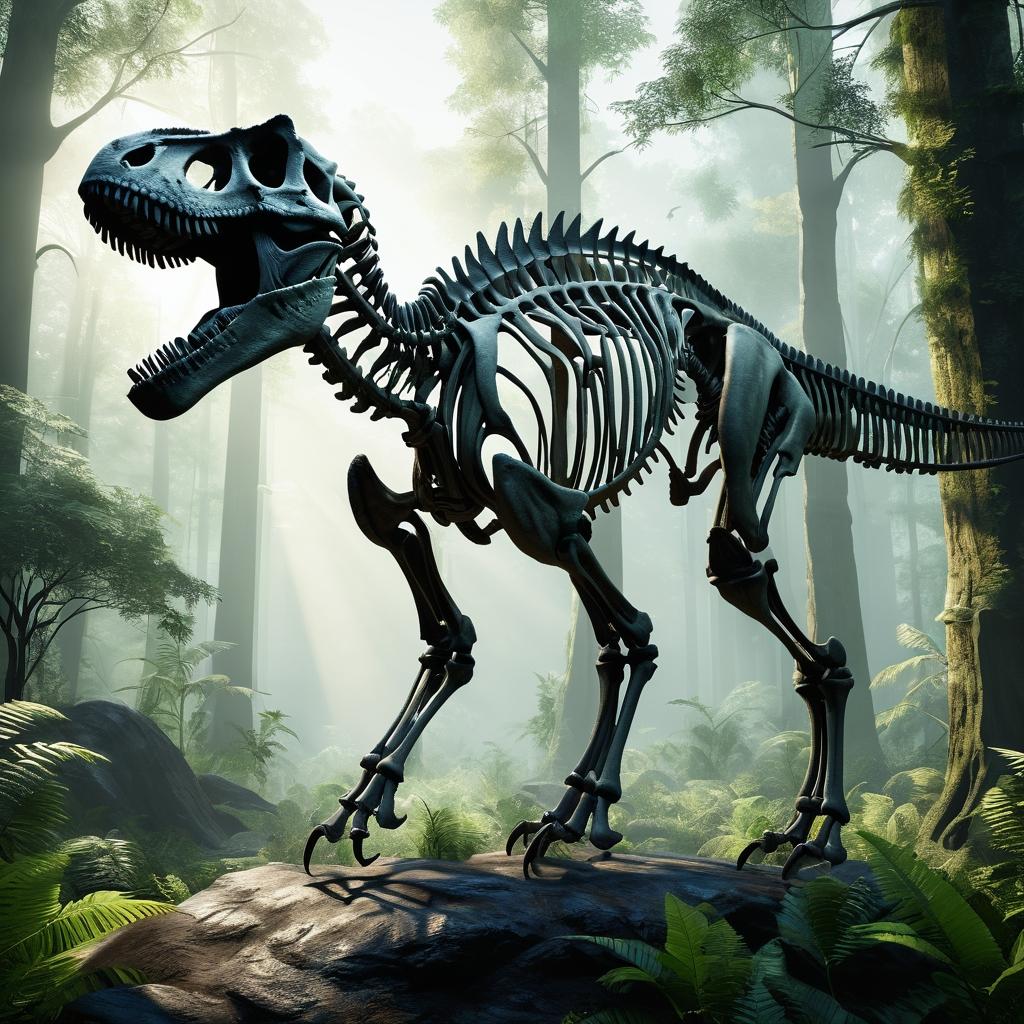 这幅作品展示了一个恐龙骨架的展示,背景是一片茂密的森林壁画。骨架的细致结构与背景的自然元素形成了鲜明的对比,强调了古生物与自然环境的关系。整体色调偏向灰色和绿色,营造出一种历史与自然交融的氛围。