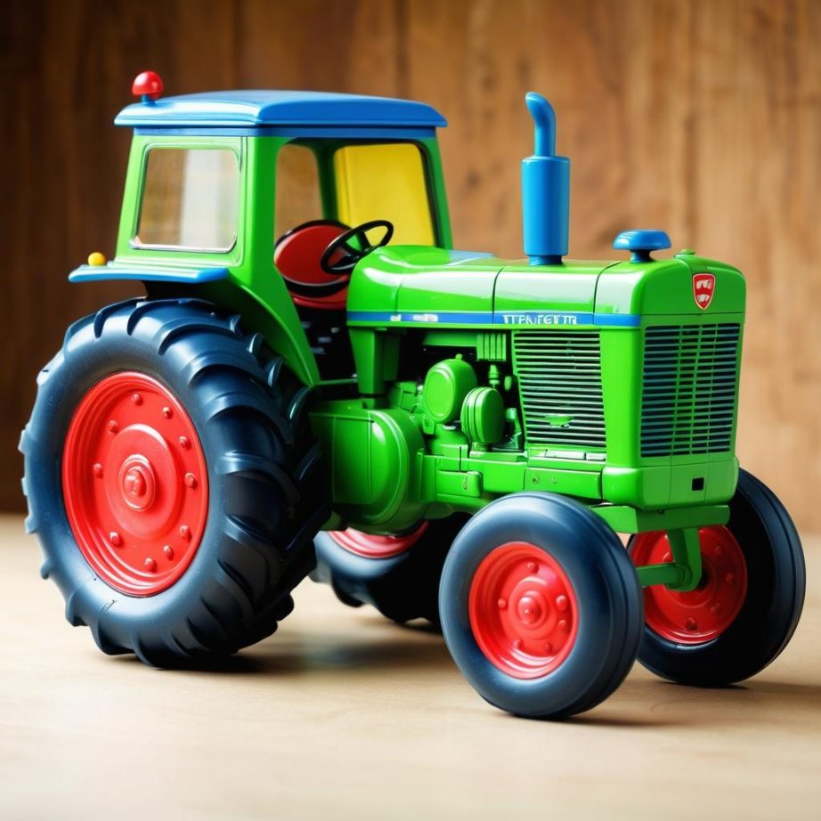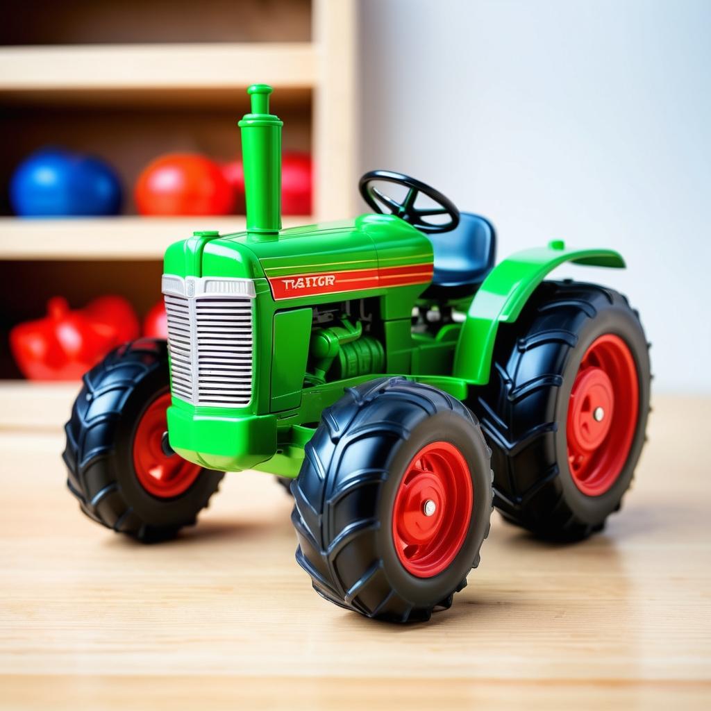 这幅作品通过展示一辆色彩鲜艳的玩具拖拉机,成功地唤起了观众的童年记忆。拖拉机的绿色车身和红色轮子在画面中显得尤为醒目,而略显模糊的背景则可能是一个商店或市场的环境,增添了一种真实感和生活气息。作品的构图很巧妙,拖拉机被置于画面的中央,成为视觉的焦点,这样的呈现方式常用于吸引儿童的注意力。在艺术创作中,色彩的运用至关重要,而这幅作品已经很好地运用了鲜明的色彩对比,增强了视觉冲击力。通过在背景中增加更多的细节,如其他玩具或孩子们快乐玩耍的场景,可以进一步丰富作品的叙事性。此外,利用光影的对比来加强作品的深度和立体感,将使画面更加引人入胜。这样的作品不仅能吸引孩子们对玩具的兴趣,还能带给成人一份对过往时光的温暖记忆。通过不同的视角展现拖拉机的细节,可以增加作品的趣味性和观赏性,使其在儿童与成人观众中皆能产生共鸣。