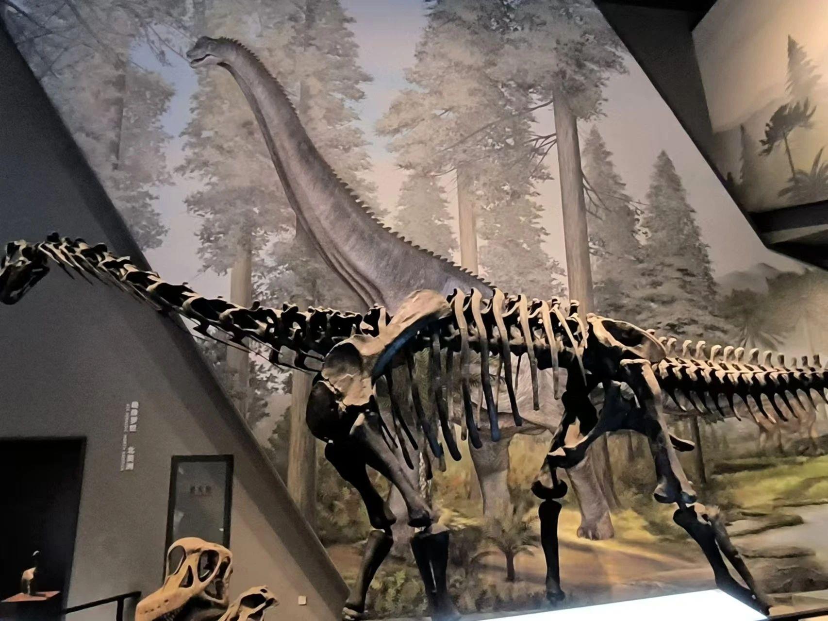 在这幅作品中,我们被带入了一个充满历史感的世界。恐龙骨架的展示不仅仅是对古生物学的致敬,更是对自然与历史的深刻探索。作品通过细致的骨架结构与背景自然元素的结合,成功地营造出了史前时代的氛围。背景中的森林壁画,虽然色调朴素,却充满了生命的气息,仿佛在诉说着地球远古的故事。