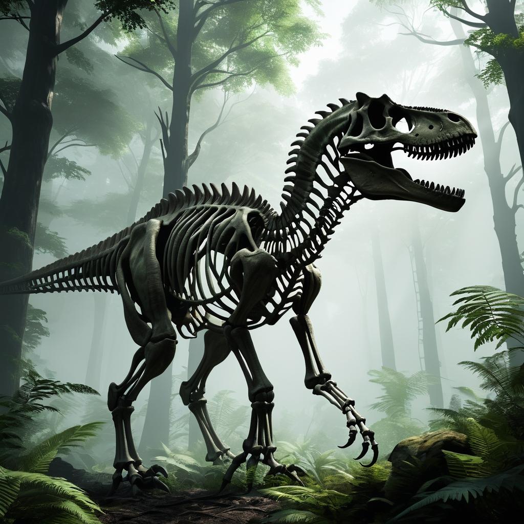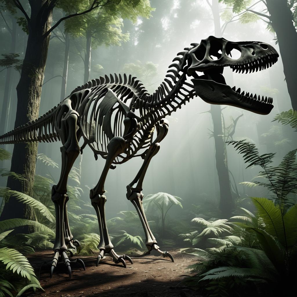这幅作品展示了一个恐龙骨架的展示,背景是一片茂密的森林壁画。骨架的细致结构与背景的自然元素形成了鲜明的对比,强调了古生物与自然环境的关系。整体色调偏向灰色和绿色,营造出一种历史与自然交融的氛围。