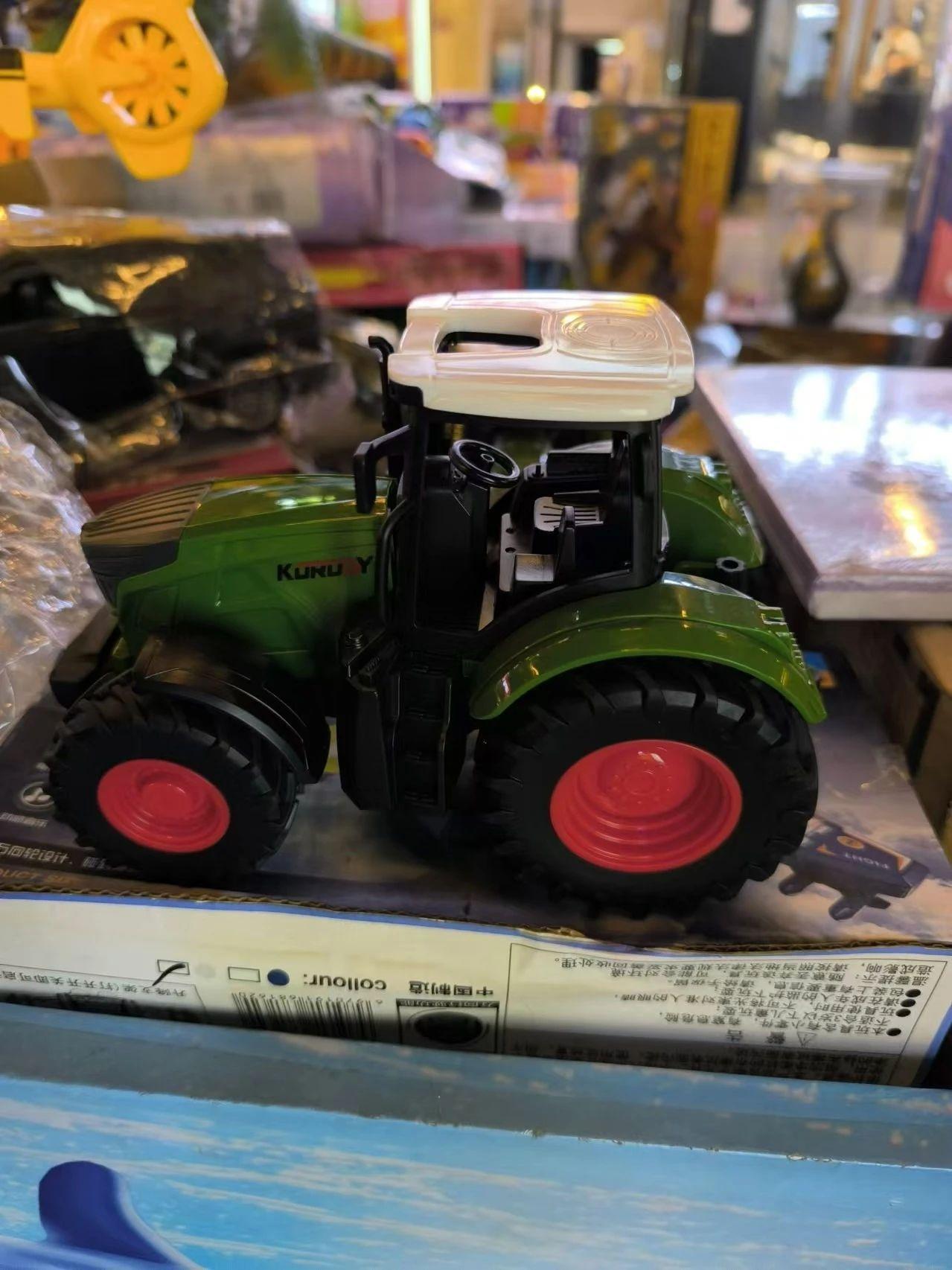 这幅作品展示了一辆玩具拖拉机,色彩鲜艳,以绿色为主色调,配有红色轮子和白色车顶。背景略显模糊,可能是一个商店或市场的环境。这种构图使拖拉机成为视觉中心,吸引观众的注意力。作品传达了一种简单的童趣和怀旧感,可能意在唤起人们对童年玩乐时光的回忆。