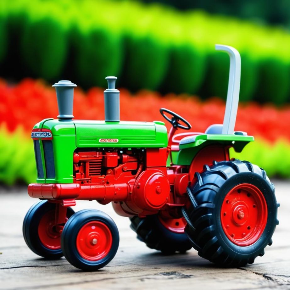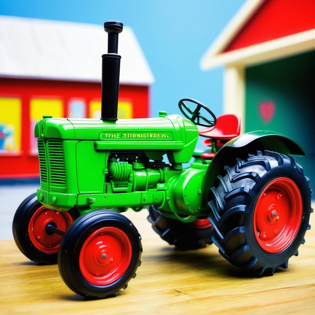 这幅作品通过展示一辆色彩鲜艳的玩具拖拉机,成功地唤起了观众的童年记忆。拖拉机的绿色车身和红色轮子在画面中显得尤为醒目,而略显模糊的背景则可能是一个商店或市场的环境,增添了一种真实感和生活气息。作品的构图很巧妙,拖拉机被置于画面的中央,成为视觉的焦点,这样的呈现方式常用于吸引儿童的注意力。在艺术创作中,色彩的运用至关重要,而这幅作品已经很好地运用了鲜明的色彩对比,增强了视觉冲击力。通过在背景中增加更多的细节,如其他玩具或孩子们快乐玩耍的场景,可以进一步丰富作品的叙事性。此外,利用光影的对比来加强作品的深度和立体感,将使画面更加引人入胜。这样的作品不仅能吸引孩子们对玩具的兴趣,还能带给成人一份对过往时光的温暖记忆。通过不同的视角展现拖拉机的细节,可以增加作品的趣味性和观赏性,使其在儿童与成人观众中皆能产生共鸣。