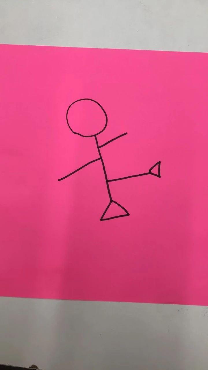 这幅作品展示了一幅简单的火柴人画作,背景为明亮的粉红色。火柴人以黑色线条勾勒,动态的姿势可能传达出一种轻松或愉悦的心情。作品的简约风格可能旨在表达一种直接和纯粹的情感。