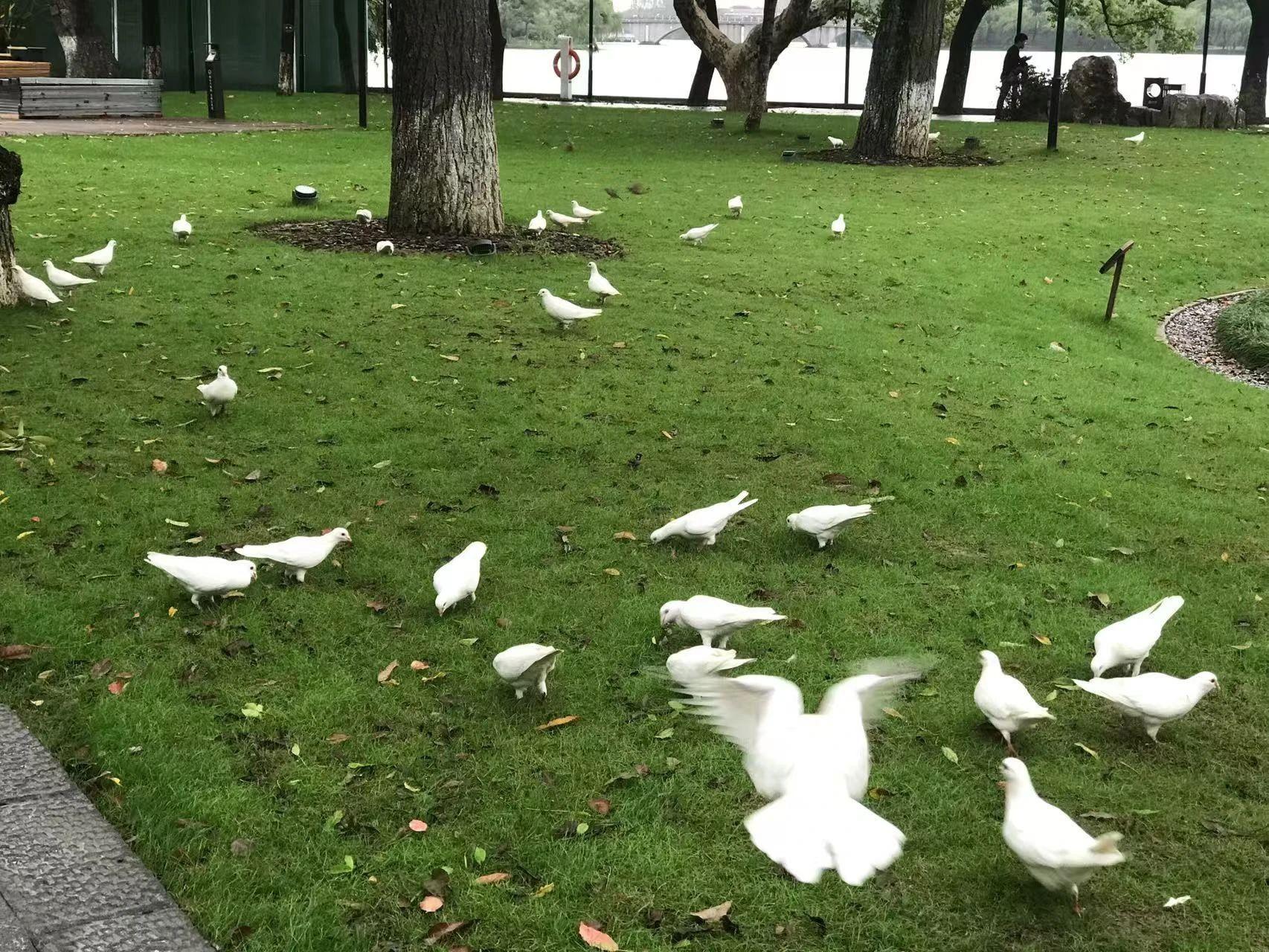 在这幅作品中,我们看到了自然之美与和谐的瞬间。白鸽在绿草地上自在地觅食和飞翔,象征着和平与自由。画面中的绿色与白色形成了鲜明的对比,给人以视觉上的清新感。背景中的河流和树木为画面增添了深度,使观者仿佛置身于一个宁静的自然环境中。
