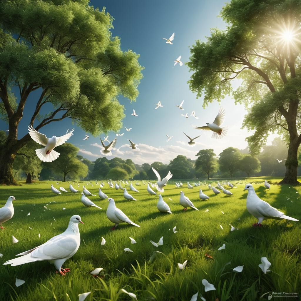 作为环境艺术策展人,我认为这幅作品成功地传达了人与自然和谐共处的理念。为了使作品更具艺术感染力,可以考虑在画面中加入一些阳光的暖色调,增加画面的温暖感。同时,通过调整鸽子的排列,使其形成一种自然的流动性,可以为作品增加动感。此外,添加一些细节,如草地上的露珠,能使画面更加生动逼真。