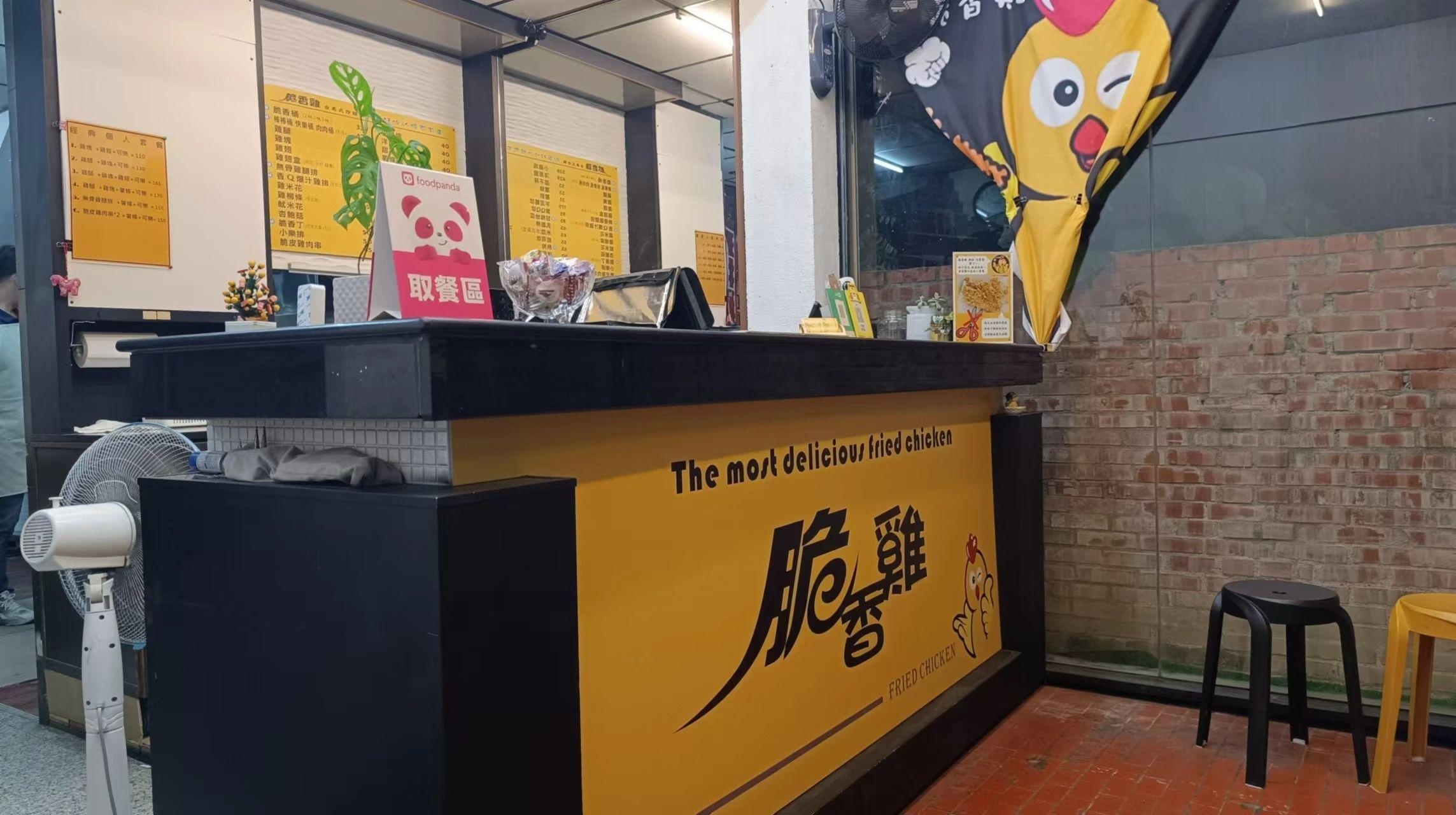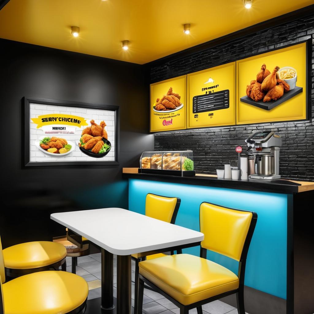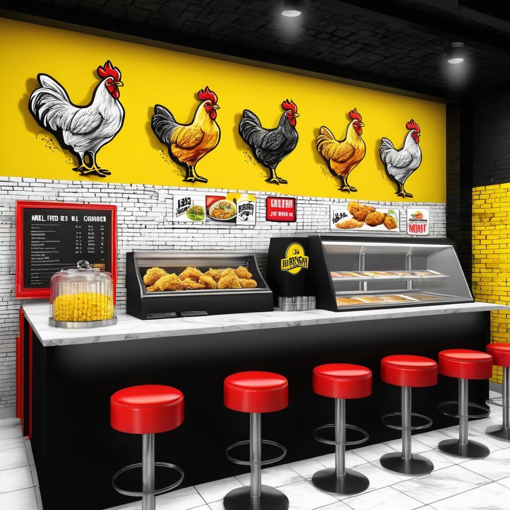这幅图像呈现了一个餐厅的柜台区域,使用了明亮的黄色和黑色作为主要颜色。柜台上的标志和装饰物,如卡通鸡的旗帜和菜单,传达了轻松和愉悦的氛围。色彩对比鲜明,凸显了主题——炸鸡店。墙壁的砖纹理增加了一种复古的氛围,可能暗示着一种传统或本地化的餐饮体验。