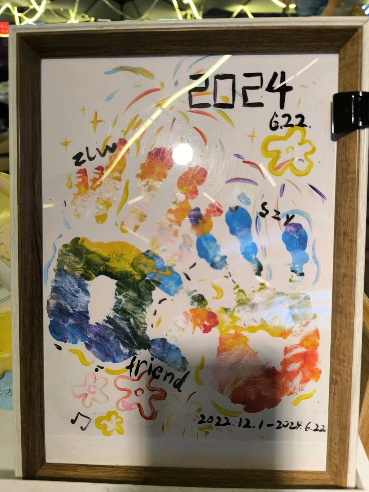 这幅作品主要由手印和鲜艳的色彩组成,传达了一种欢乐和友谊的情感。色彩多样且饱满,包含蓝色、绿色、黄色和红色,形成一种活力四射的氛围。背景上有日期和简单的图案,如星星和音符,增添了画面的趣味性。整体构图简单但充满童趣,可能表达了对未来的期待和对友情的珍视。