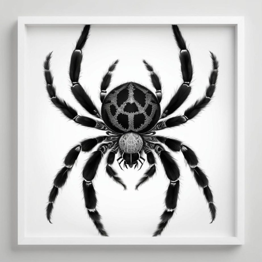 这幅作品展示了两个简约的黑色蜘蛛图案,背景为浅灰色。线条简单而流畅,给人一种古朴而神秘的感觉。可能意在探讨自然界中的对称与变化,或者以蜘蛛为象征,传达某种隐喻或文化意义。