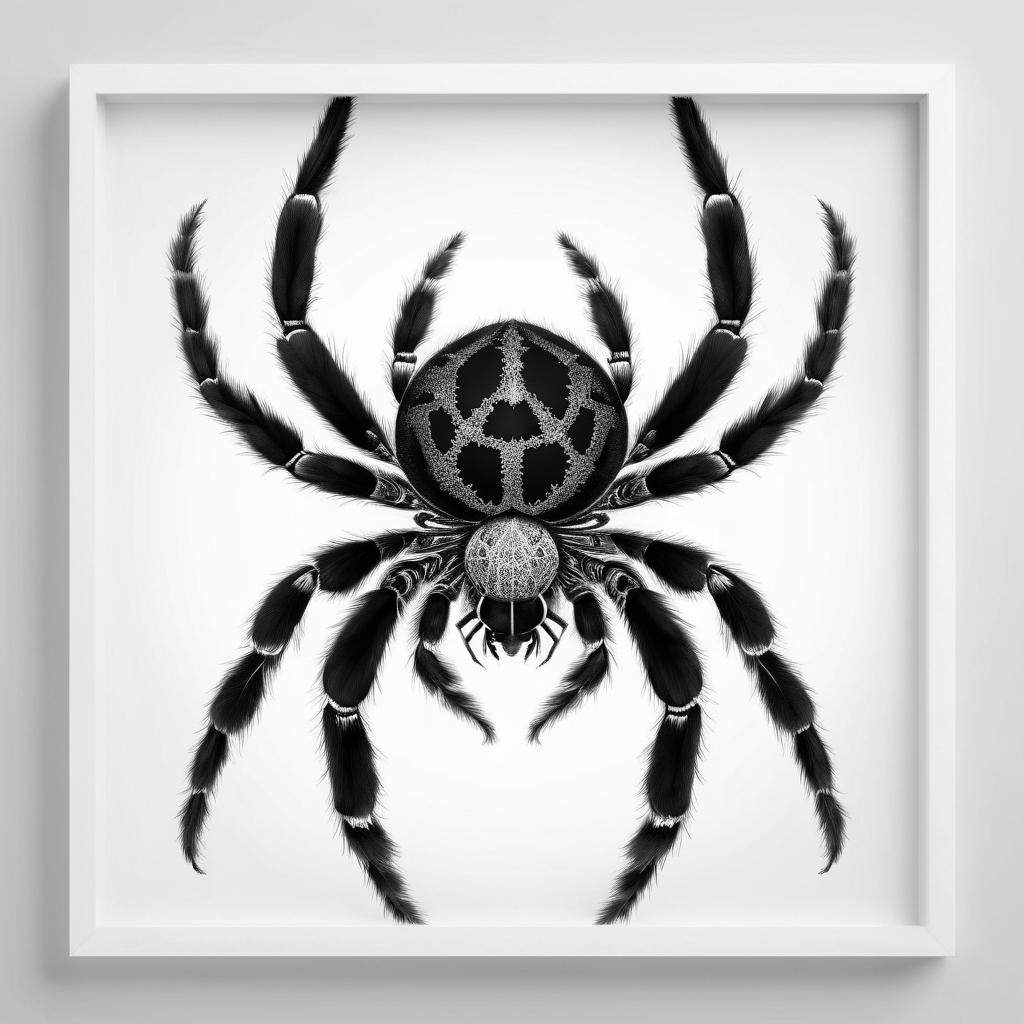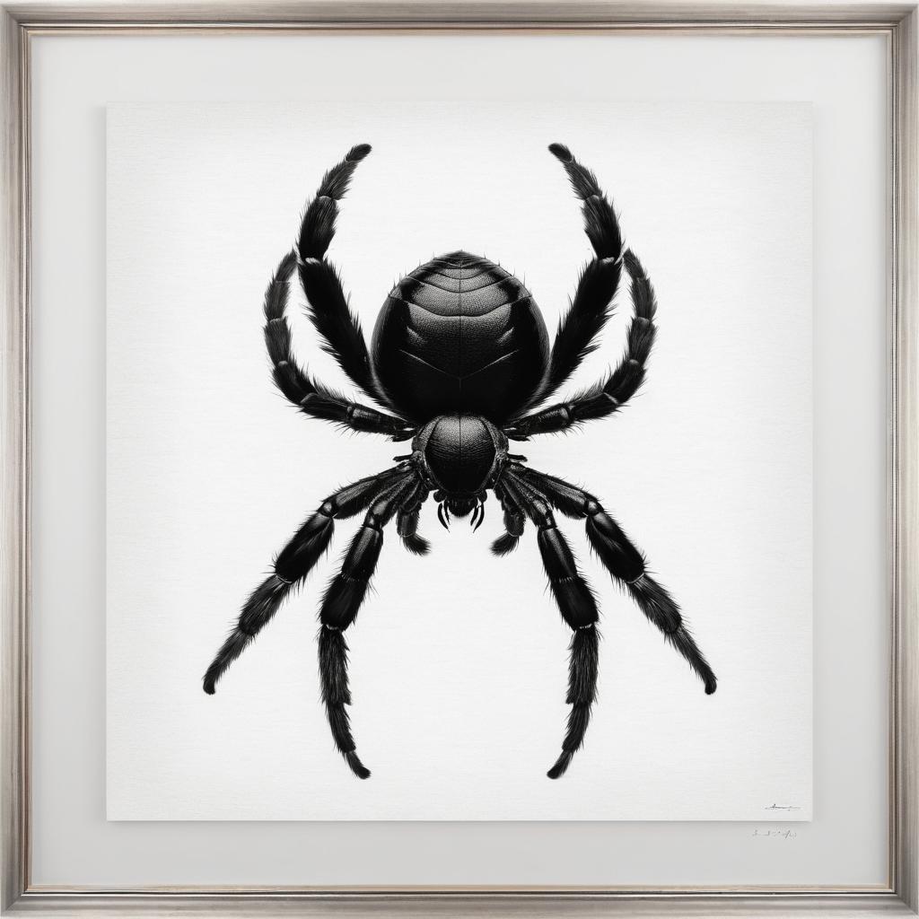为了进一步提升这件作品的艺术价值,可以考虑在背景上增加一些纹理或色彩的层次,这不仅能增加视觉上的深度,还能赋予作品更多的细节和故事性。此外,通过改变蜘蛛的姿态或者加入其他自然元素,如树叶、网等,可以使整个画面更加丰富有趣。这种处理方式能够引发观众对自然与艺术之间关系的更深入思考。