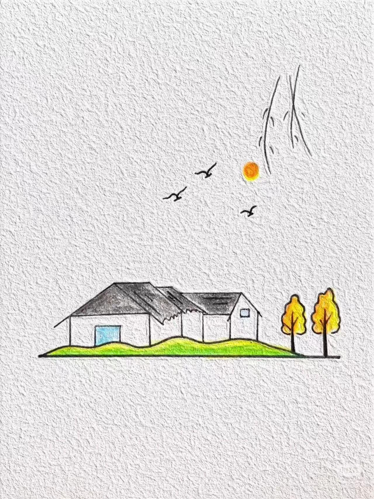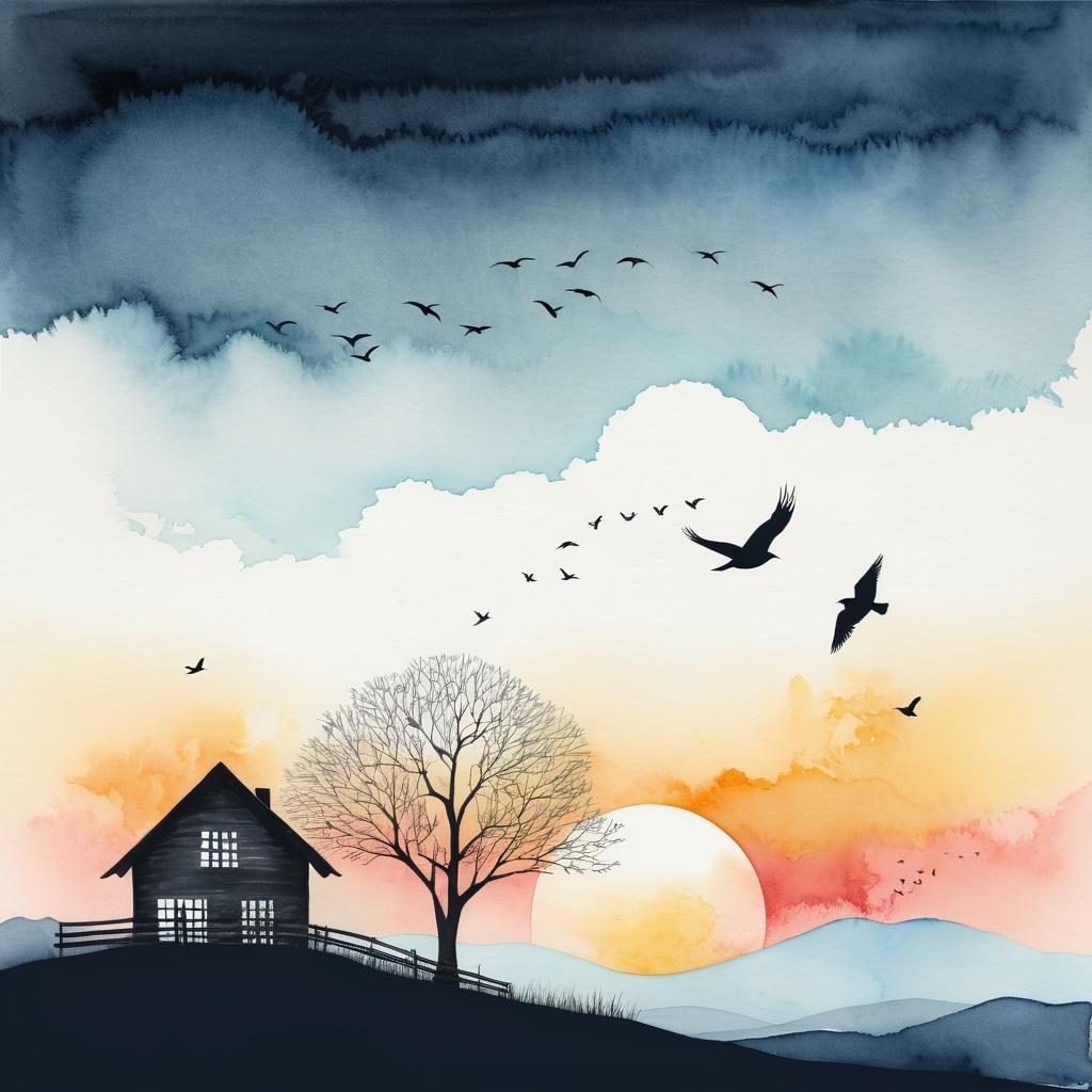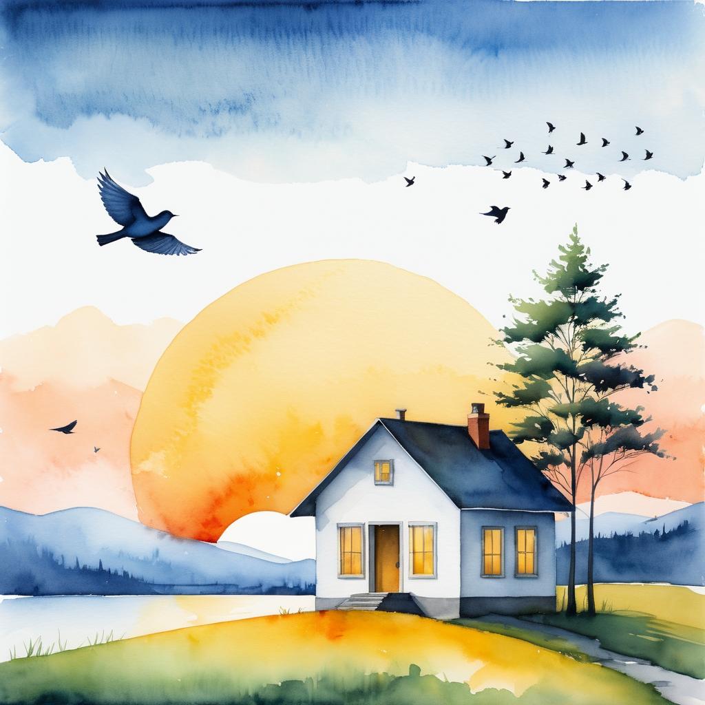 这幅作品使用简洁的线条和柔和的色彩,描绘了一座房屋、几只飞鸟、太阳和两棵树。整体构图简约,给人一种宁静和平和的感觉。创作者可能想要传达乡村生活的宁静,或自然与人类建筑物的和谐共处。